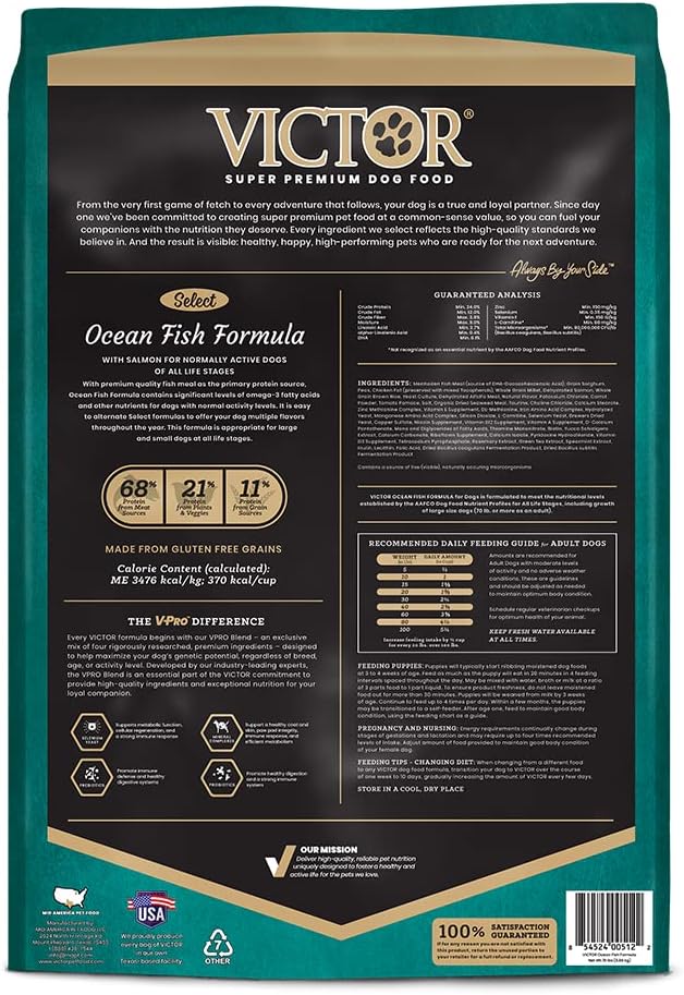 - HIGH QUALITY INGREDIENTS: VICTOR’s Select line of dog kibble offers specific proteins in a variety of formulated blends; Ocean Fish dog food features premium-quality fish meal as the primary source of protein, and is made with gluten-free grains, as well as salmon