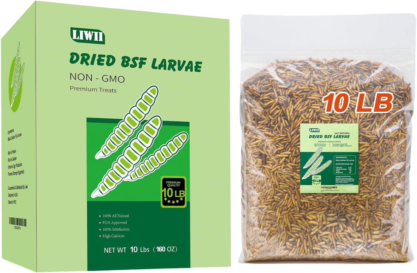 - High Calcium Treats For Hens - 10LBS Black Soldier Fly Larvae contains 45% Protein, 5% Calcium and the rich source of vital nutrients. The extra calcium(more than dried mealworms) helps your flock lay better eggs in and out. The eggs are much firmer and whites are thicker that can hold the yolks up high and round. The eggshell appears to be clean and strong.