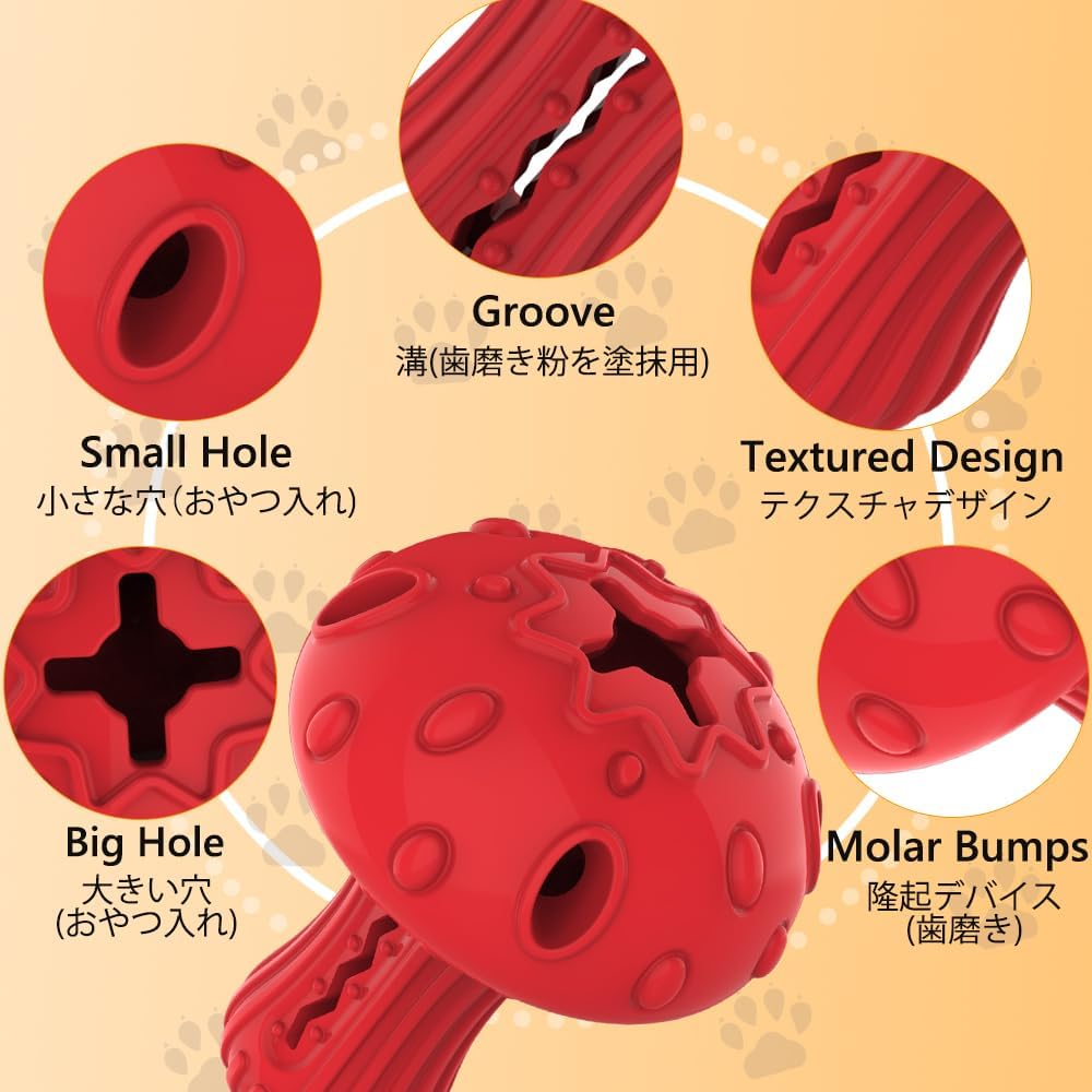 - Teeth Cleaning Toy: There are ridges and bumps on the surface of the mushroom doggy toy and a groove in the stem where you can insert jerky or apply dog toothpaste or peanut butter. It attracts dogs’ interest and helps them clean teeth while teething.