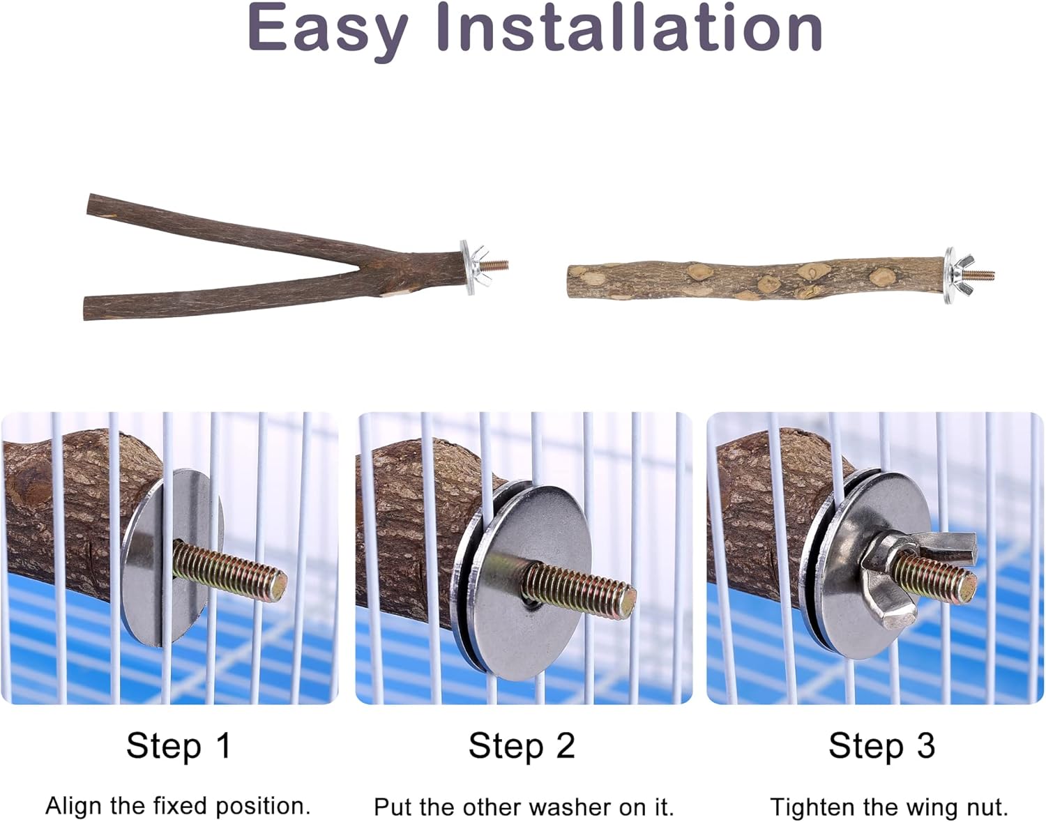 - 【Easy Installation】: The bird perches are suitable for all bird cages. Each bird perch is equipped with built-in bolt and wing nut, super easy to install and dismantle. Once intalled it will not fall off from the cage, safe for birds to rest or play on.