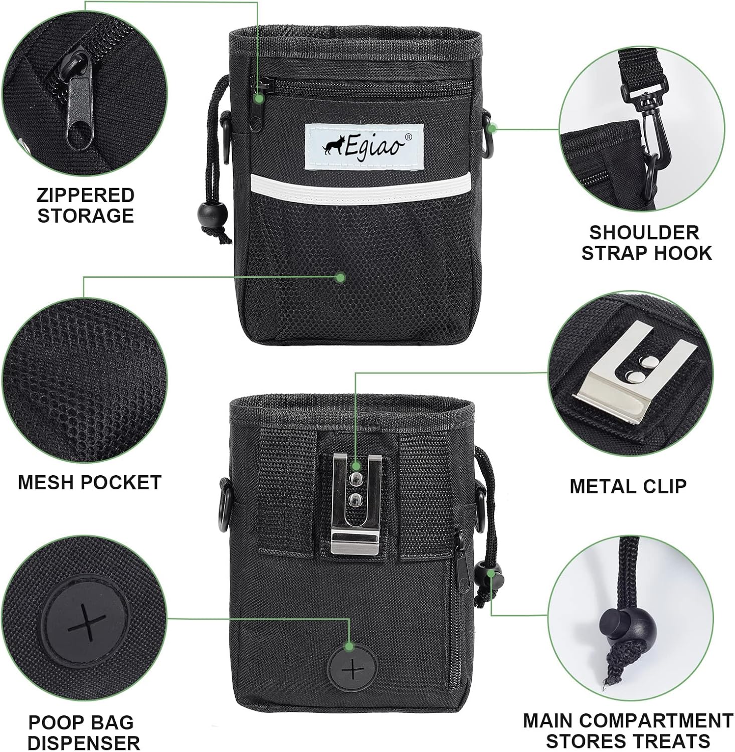 - 🐾Multifunctional Dog Treat Pouch: Our dog treat bag has an enlarged storage capacity with Drawstring Closure. The front mesh pocket can hold some dog training toys, and the enlarged zipper pocket can hold mobile phones, ID cards, etc. The small bag on the side can hold small items, and the garbage bags can be pulled out directly from the small holes reserved on the back, which is convenient and quick. D-rings can be used to hang keys, dog clickers, etc.