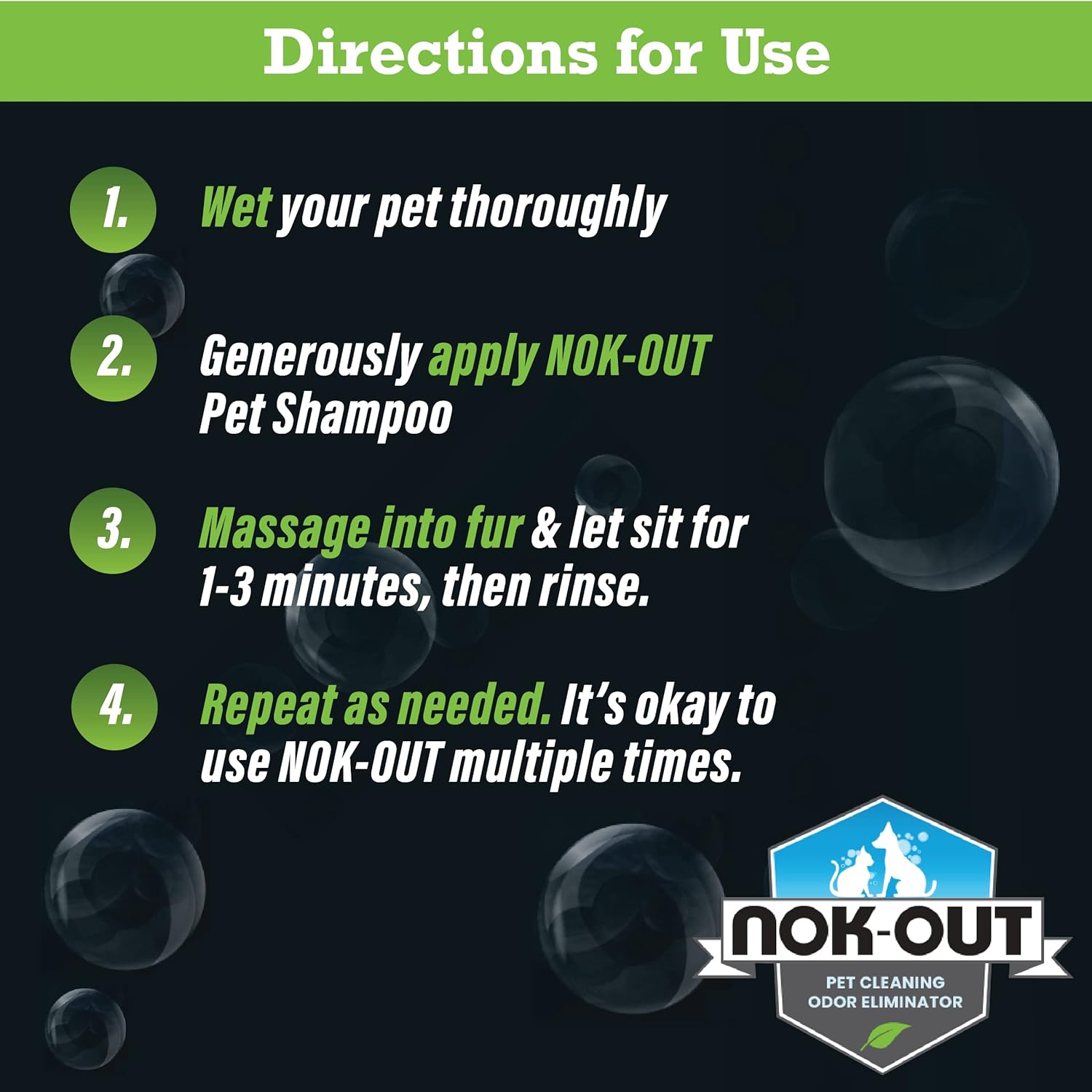 - Directions For Use: Thoroughly wet your pet’s coat before generously applying shampoo. Massage product into fur and then let set for 1-3 minutes. Rinse out shampoo and dry or repeat as needed.