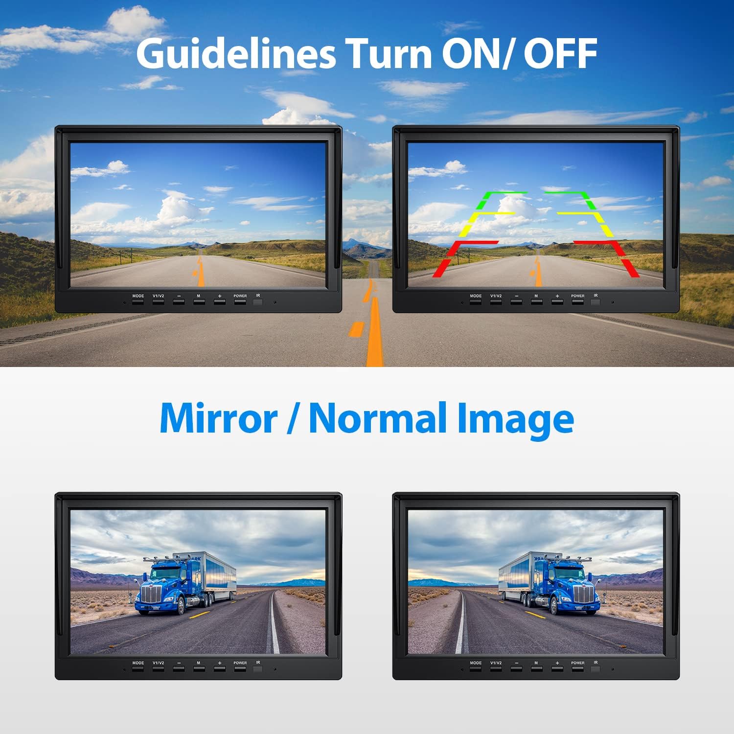 - 👍Split Screen and Parking Guidelines: This monitor will display up to 4 cameras simultaneously or individually for bigger image, no more blind spots. With the parking guidelines, it can help you to judge the distance between your car and the object around it, which can make your parking safer and easier. What's more, you can change the image to front view or rear view, so you can use one of the camera as the front view camera. Monitor dimension: 9.84 inch(L)*6.46 inch(H)