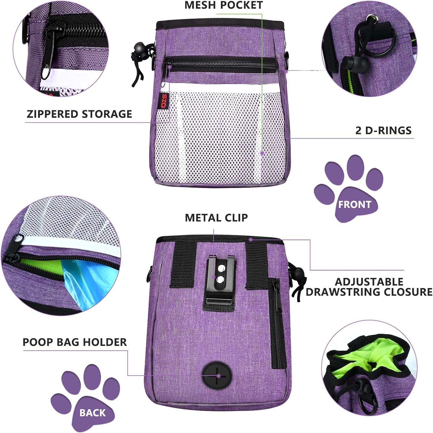 - Multi-Function Treat Pouches for Pet Training — The dog treat pouch can easily store kibble, toys, treats, poop bag and your personal belongings, such as phone, keys, wallet and so on. The D-rings can be used to hang dog clicker training kit or dog cups. The dog treat pouch keeps your hands free. Perfect for dog training at the park!