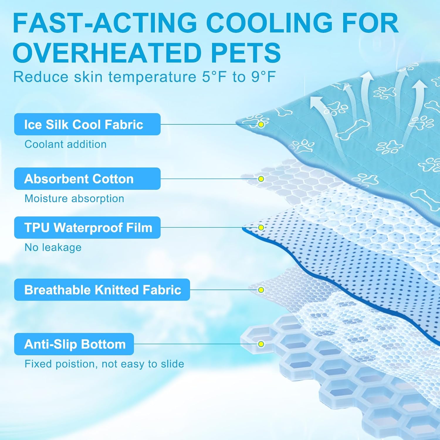 - 【Dog Cooling Mat】-- Our ice-silk technology activates instantly on contact, keeping your dog 4-9°F cooler than outdoor temperatures (5-10°C differential) for hours. Perfect for summer playtime, crate rest, or post-walk recovery—no water/electricity needed. Measures 16''x20'' to comfortably accommodate small cats and puppies