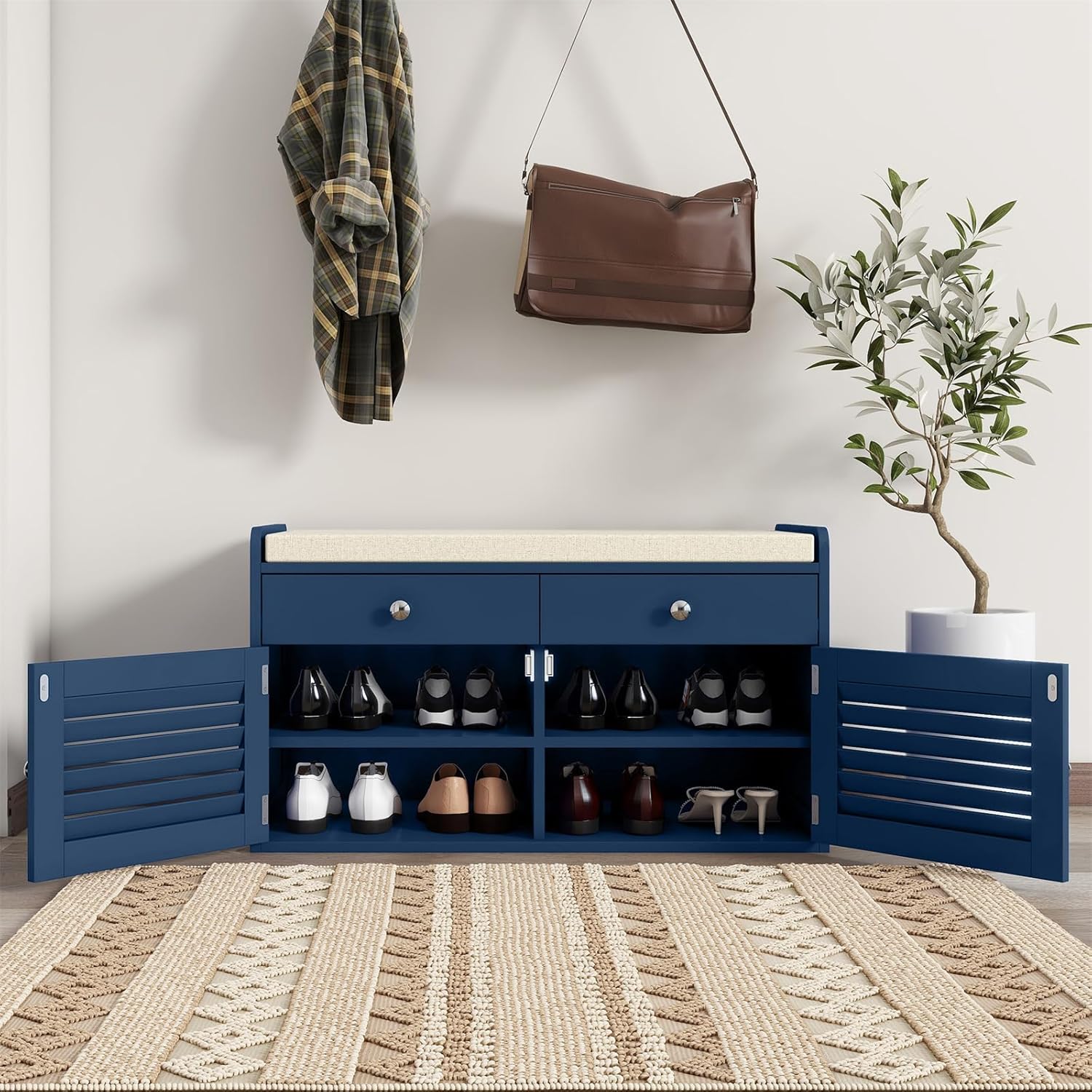 Shoe Storage Bench with 2 Drawers & 2 Doors, Entryway Bench with Cushion, 2 Adjustable Shelves, Shoe Cabinet for Entryway, Living Room, Hallway, Mudroom, Bedroom, Blue