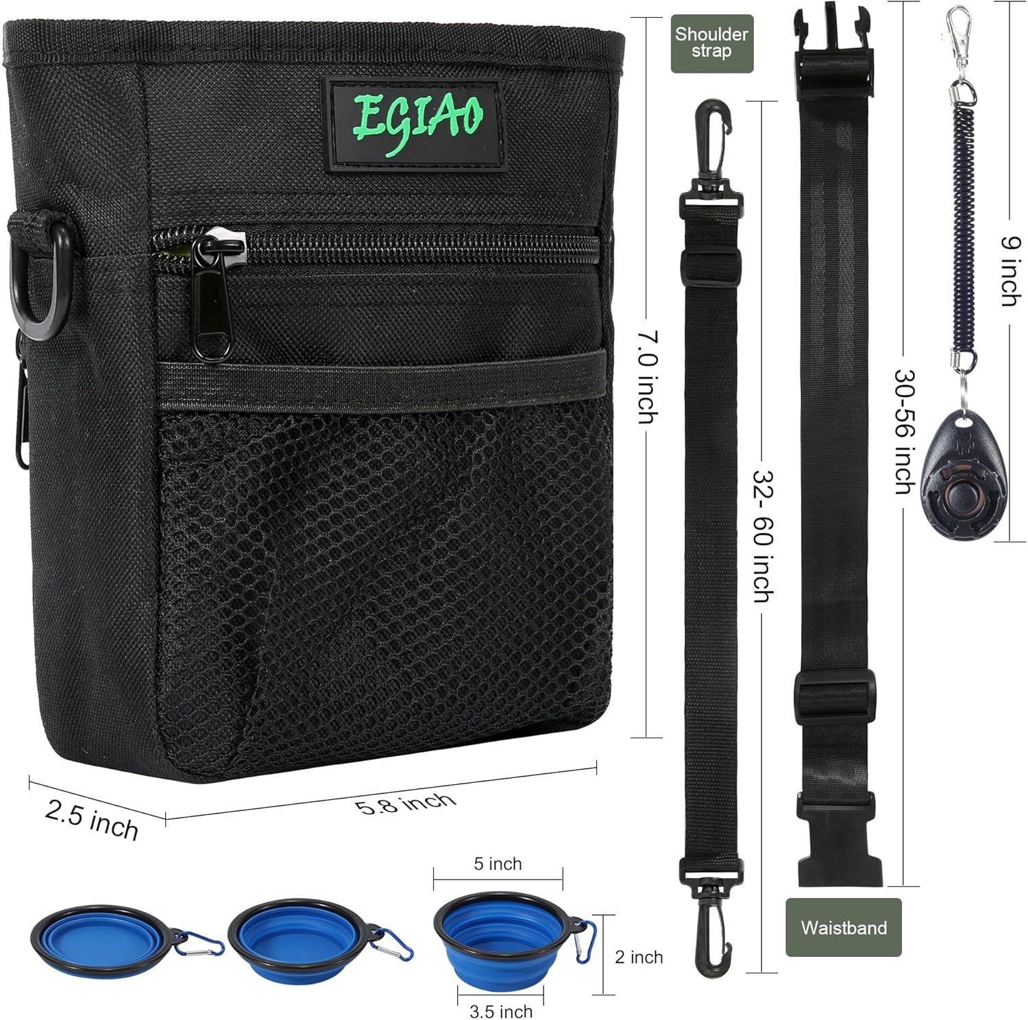 - 🐾6PCS Dog Training Kit: Includes 1 multifunctional dog training pouch, 1 collapsible dog bowl, 1 training clicker, 1 Roll of Poop Bags, 1 waist strap, 1 shoulder strap