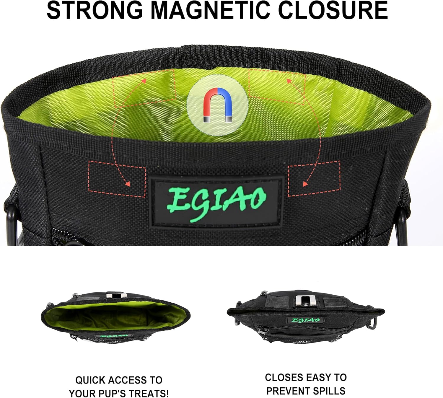 - 🐾Unique and Reasonable Design: Our dog treat pouch has a convenient magnetic closure design, which can be easily opened and closed by one-handed operation. When closed, the items in the dog food bag will not fall regardless of bending, running, etc. And dog treat bag fits your waist perfectly, helping you to reduce fatigue when interacting with the dog for a long time, and can meet all your training needs.