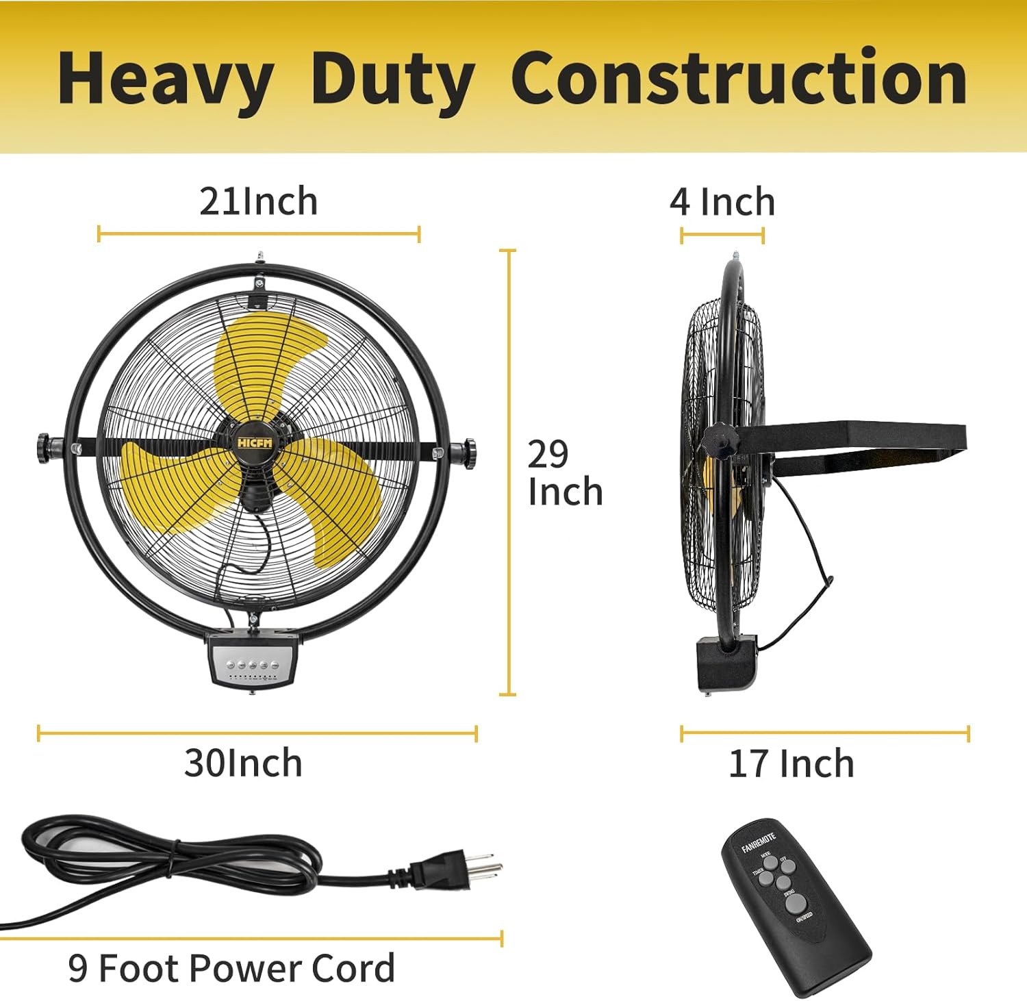 - ăMoves Much Airă: Built with 1/5 HP Powerful Motor and Turbo Blade, this Orbital Remote Control Wall Fan provides refreshing breeze for large spaces. High speed 5100 CFM / Medium speed 4400 CFM / Low speed 3900 CFM. It is ideal for Warehouse, Workshop, Factory, Garage, Basement, Industrial, Commercial and Covered Patio.