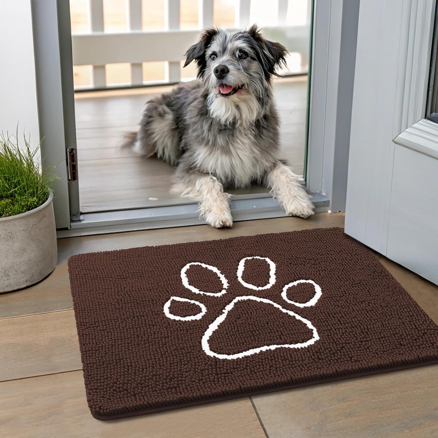 Smiry Dog Door Mat for Muddy Paws, Absorbent Dirt Trapper Non Slip Quick Dry Washable Chenille Mat for Mud Dogs, Entry Rug for Indoor and Outdoor (24x16 Inches, Brown and White)