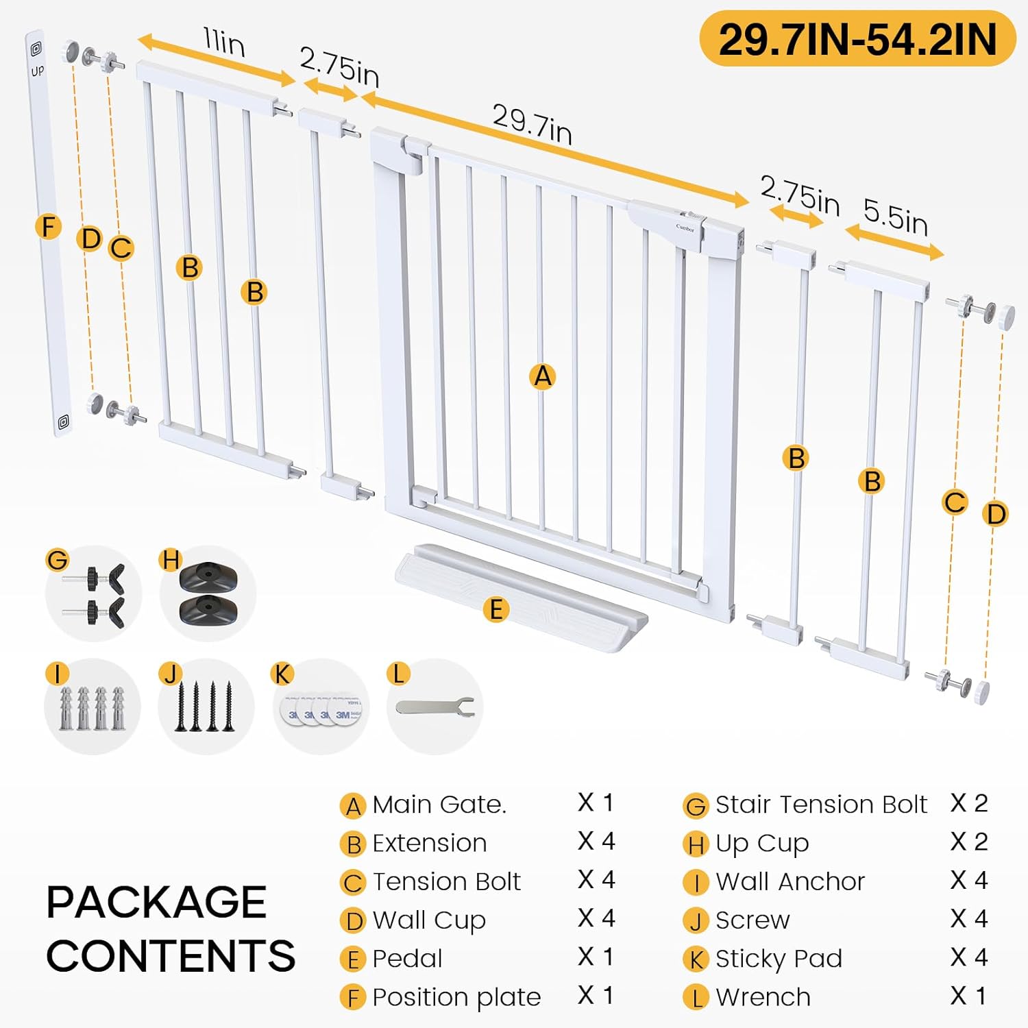 Cumbor 29.7-54.2" Wide Baby Gate for Stairs, Mom's Choice Awards Winner-Self Closing Dog Gate Indoor for Doorways, No Drilling Pressure Mounted Pet Gates for Kids, Easy Walk Through Safety Gate, White