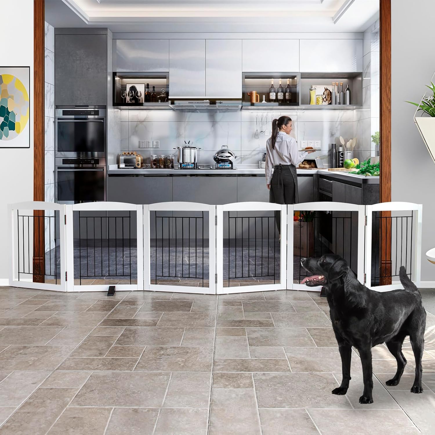 - 【6 Panels】The dog gate is built with 6 separate panels, secured together by sturdy stainless - steel hinges.