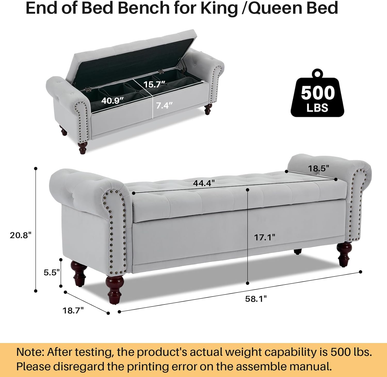 Storage Bench Upholstered Velvet End of Bedroom Bed Bench Ottoman with Tufted Cushioned Rolled Arm Large Storage Space for Reading Living Room Entryway, Light Grey