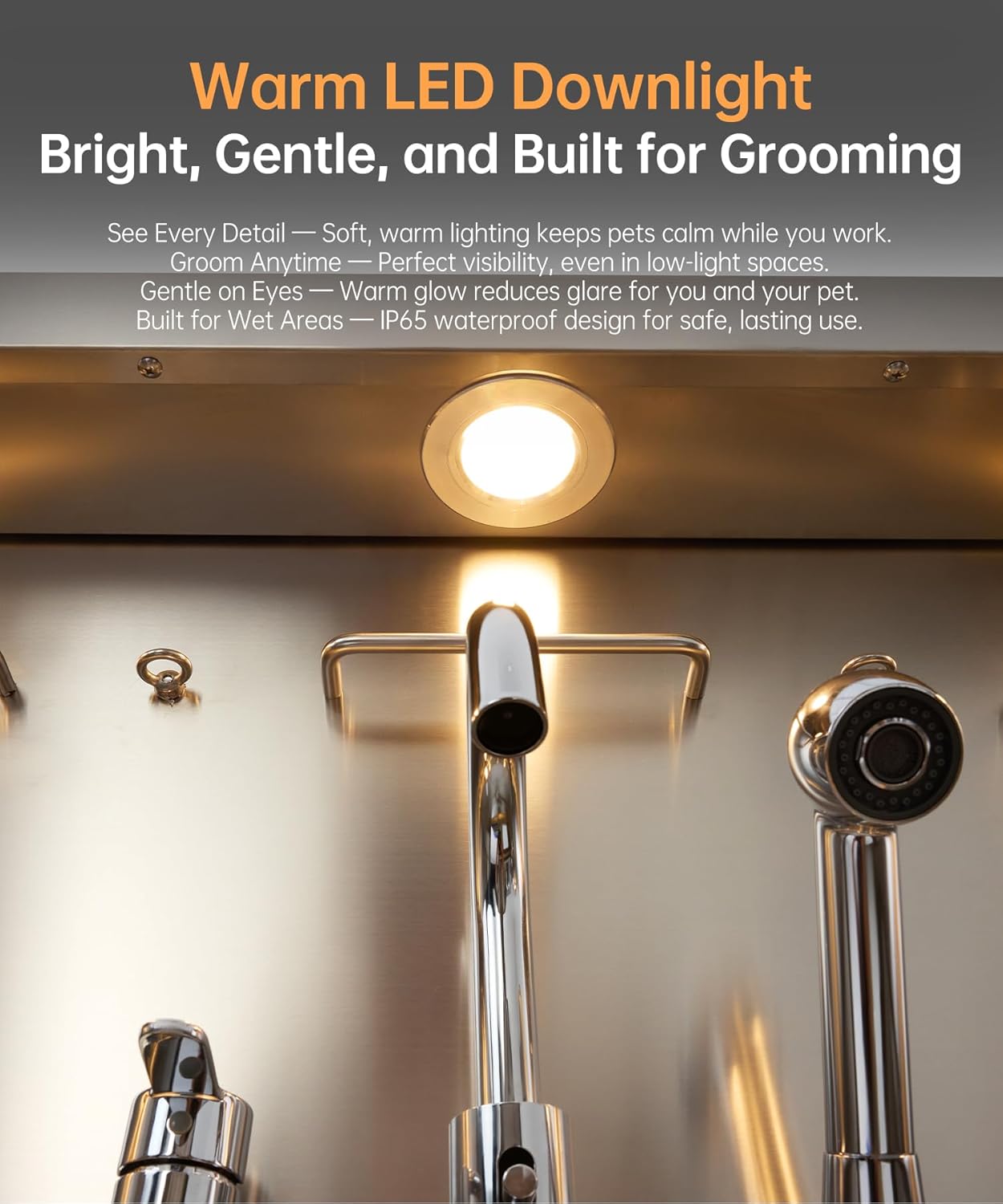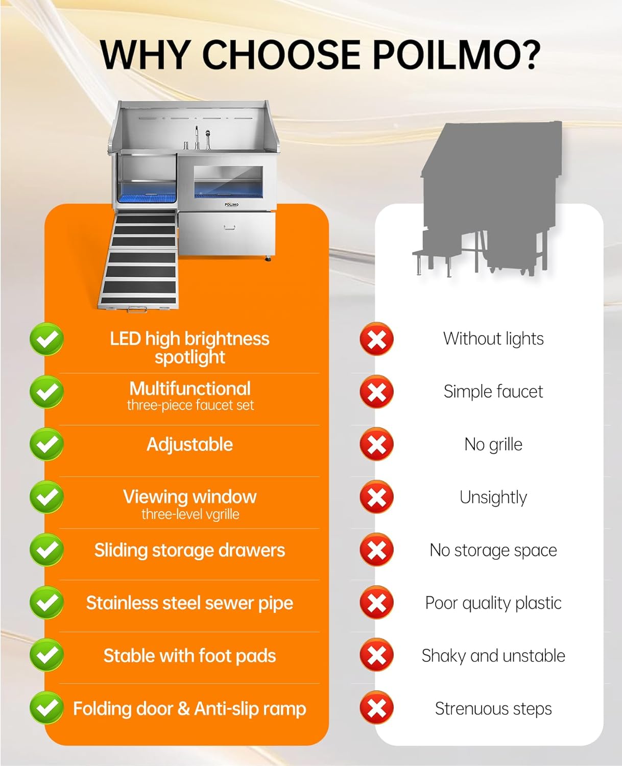 - Innovative and Practical Design: The POLIMO dog grooming station features multiple outstanding design elements: ①IP65 Waterproof high-brightness LED spotlight. ② Grade A tempered glass observation window. ③ The bathtub’s side panels feature a curved slide design, making it easier to operate④ Two-piece floor grid, adjustable to three different heights. ⑤ Sliding storage drawer for organized storage. ⑥ Multi-function faucet and showerhead, adjustable to left, center, or right positions.⑦ Two drainage options are available: one with a pet hair catcher and another stainless steel drain pipe featuring an odor-blocking S-trap design