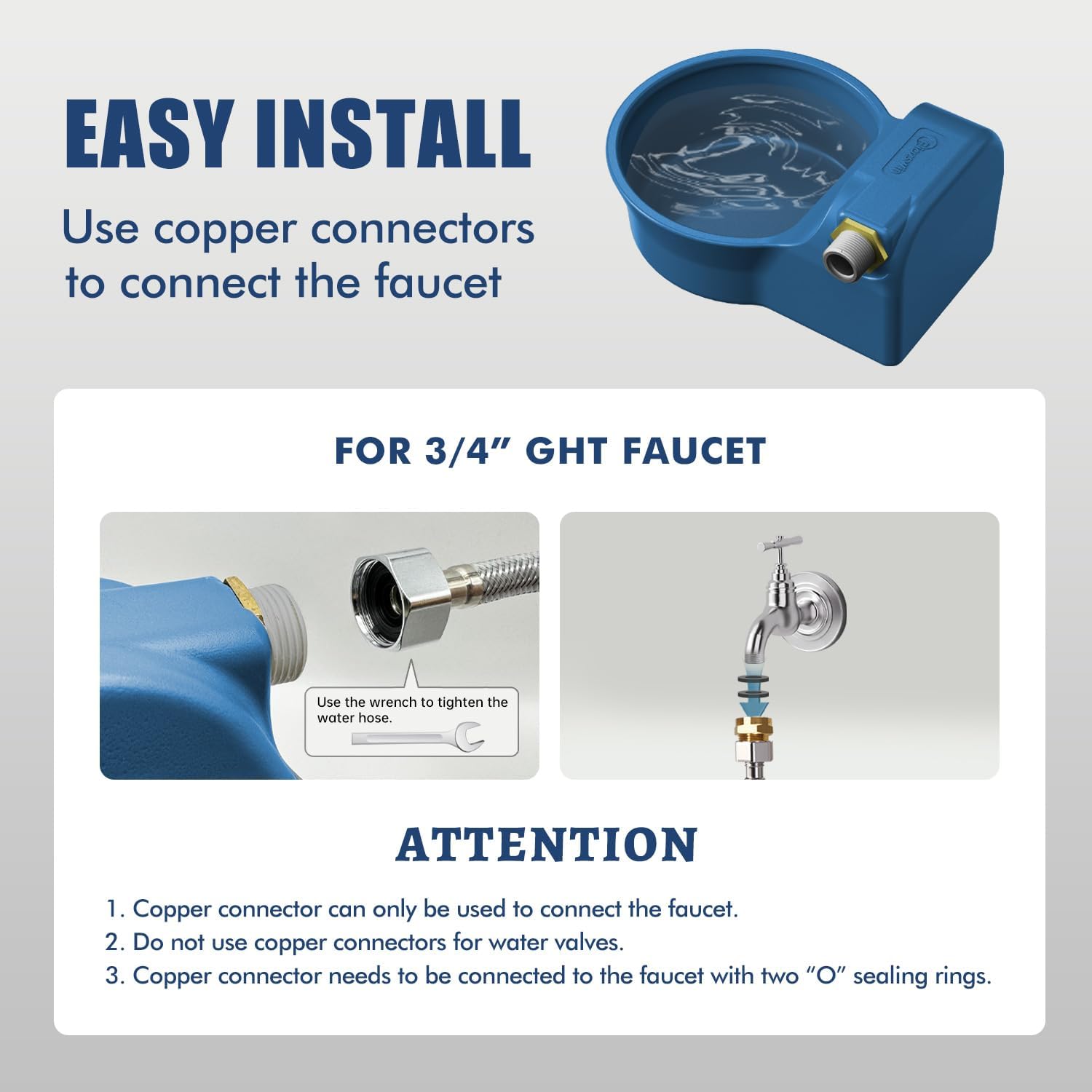 - 【Easy to Use and Install】We provide a comprehensive set of accessories required for installation. Package include water bowl, 5ft hose, copper connector, waterproof tape. The copper connector enables smoother faucet connection, suitable for connecting 3/4'' GHT faucets. Tips: Copper connectors need to be put into two"O"sealing rings