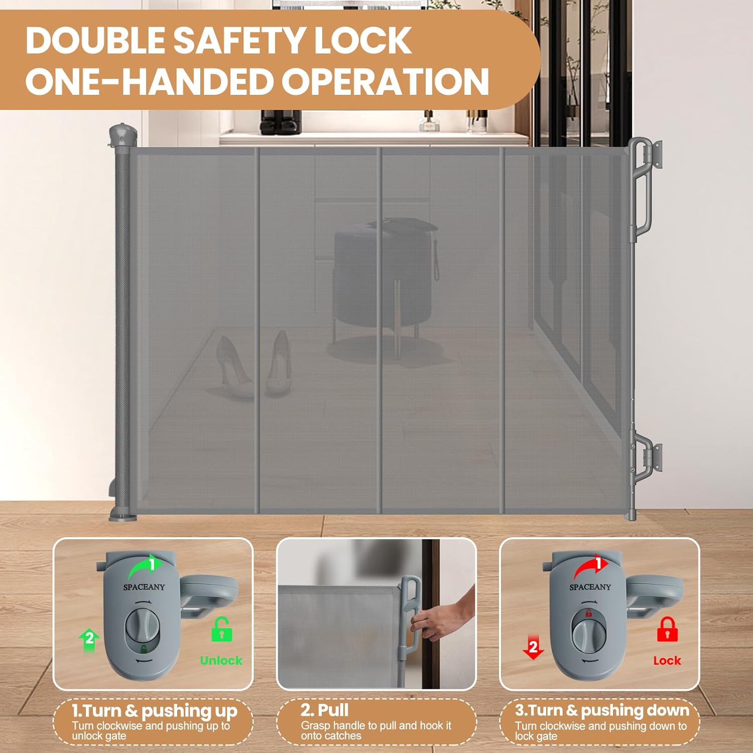 - 【Reinforced Safety Upgrade】 <1>The upgraded reinforced Retractable Baby Gates has three reinforced rods. Stronger and less prone to deformation. Prevent the top grid from sagging, deforming, and the bottom from lifting. Prevent babies and pets from crawling under gates. <2>Retractable baby gate featured with double locking mechanism creates a safety home for your curious crawlers and keep them away from danger, providing a safe, closed off environment to play.