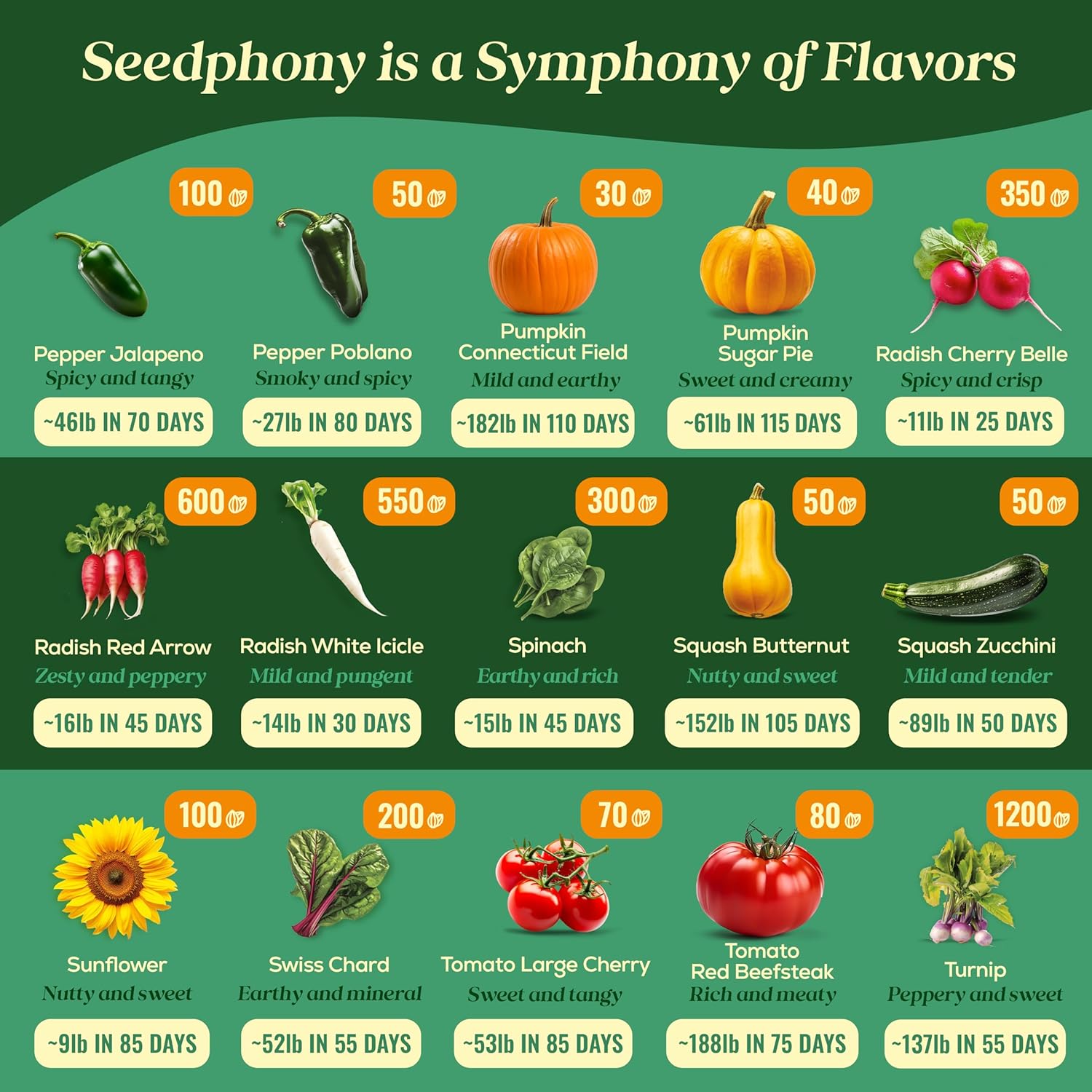 - 50 Gourmet Garden Vegetable Seeds Varieties: Grow your own delicious vegetables with over 34,455 heirloom seeds, including: Artichoke, Arugula, Bean, Beet Detroit Dark Red, Bok Choy, Broccoli, Broccoli Raab Rapini, Brussel Sprouts, Cabbage, Carrot Imperator 58, Carrot Royal Chantenay, Carrot Scarlet Nantes, Cauliflower, Celery, Collards, Corn, Cucumber Pickling, Cucumber Slicing, Curled Cress & plenty more!
