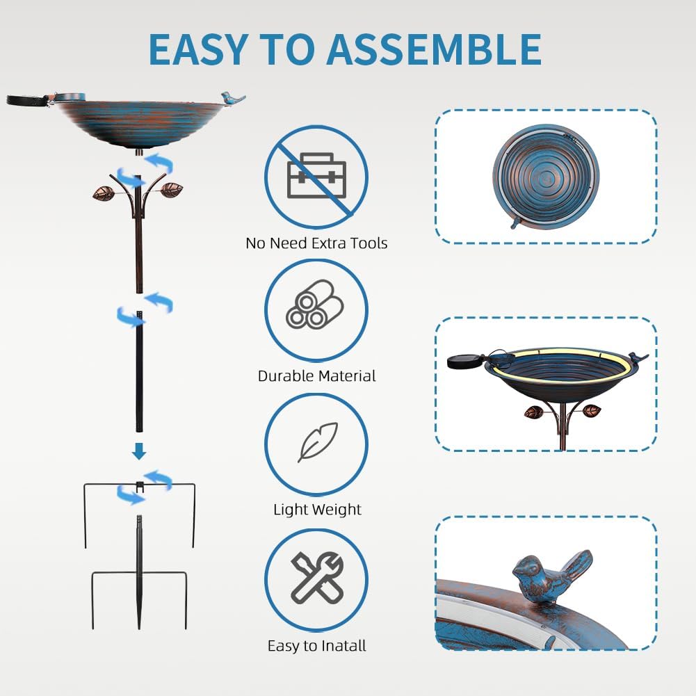 - Durable and Sturdy: The outdoor bird bath is made of premium metal and coated with multi-layer powder, rust-proof, wind-proof and rain-proof. Upgraded 5 prongs make this standing birdbath stay in the soil of your garden firmly