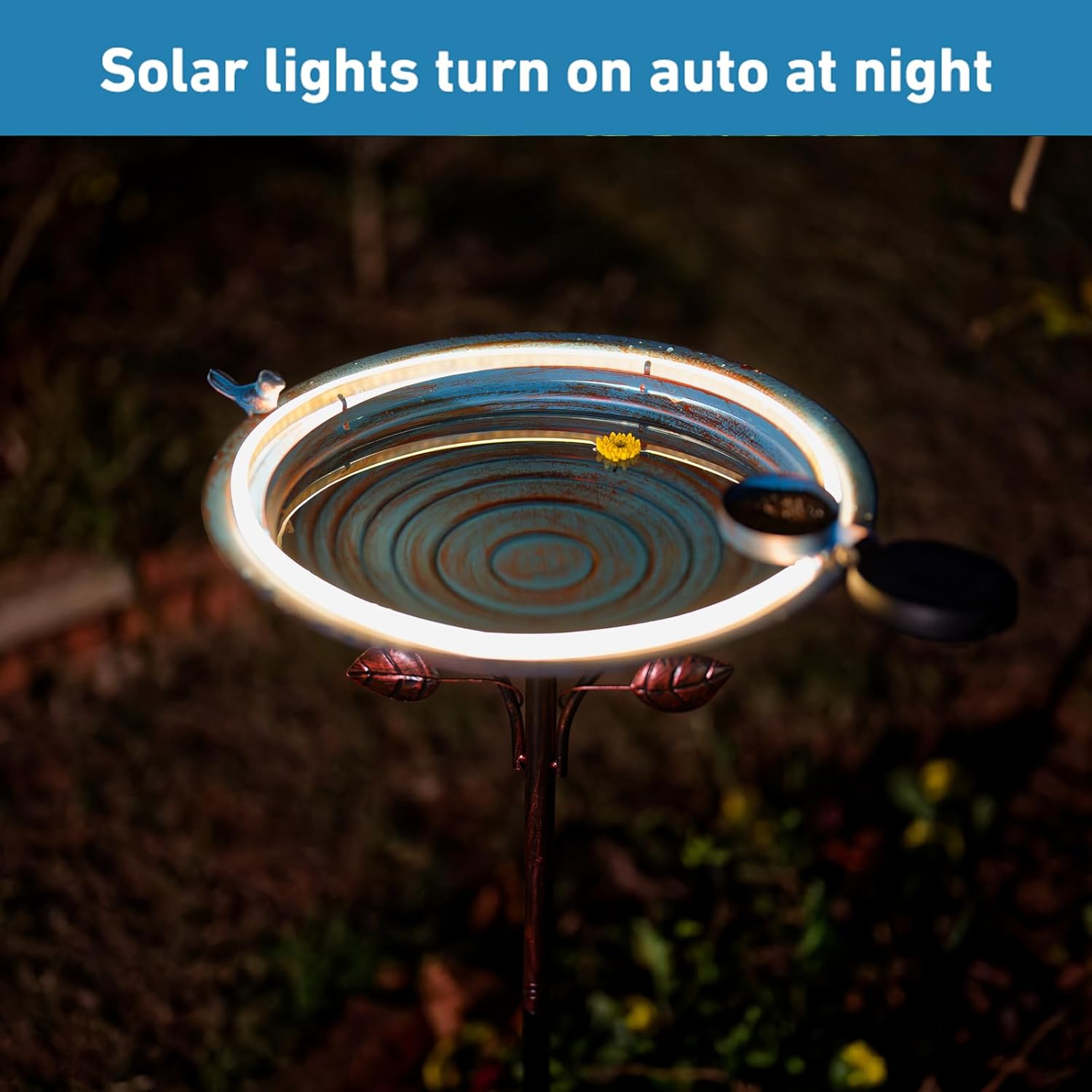 - Bird Bath with Solar Light: This metal bird bath measures 39 inches high x 15 inches diameter. Designed with a circle of light strip around the edge of the birdbath bowl, it will automatically absorb sunlight during the day and light up at night, great for decorating the garden