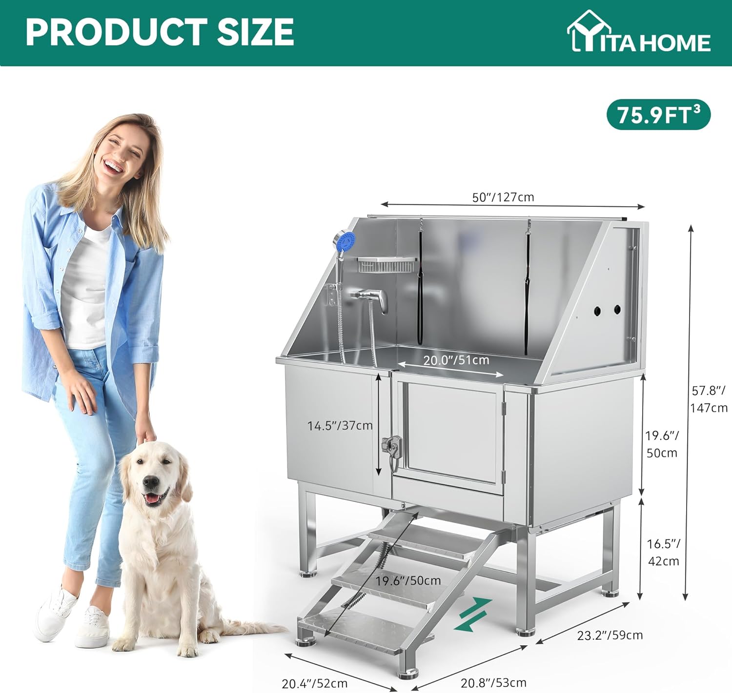 - Safe and Convenient Design: YITAHOME dog bathtub for large dogs includes a reliable door lock to prevent accidental opening; The hideable stair comes with a new limiting screw for secure stepping when pulled out; An attached leash holder can also be used to hang towels