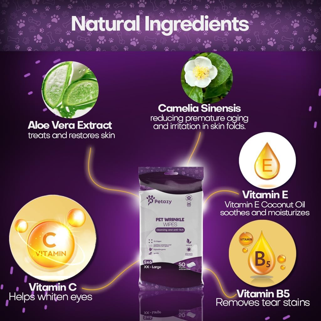 Wrinkle Wipes for Dogs | 3X Larger Dog Face Wipes for French Bulldog and Pug - Cleanse Skin Folds, Tear Stains, Tail Pockets | Anti-Itch, Soothing, & Hypoallergenic with Coconut Oil | 50 Count