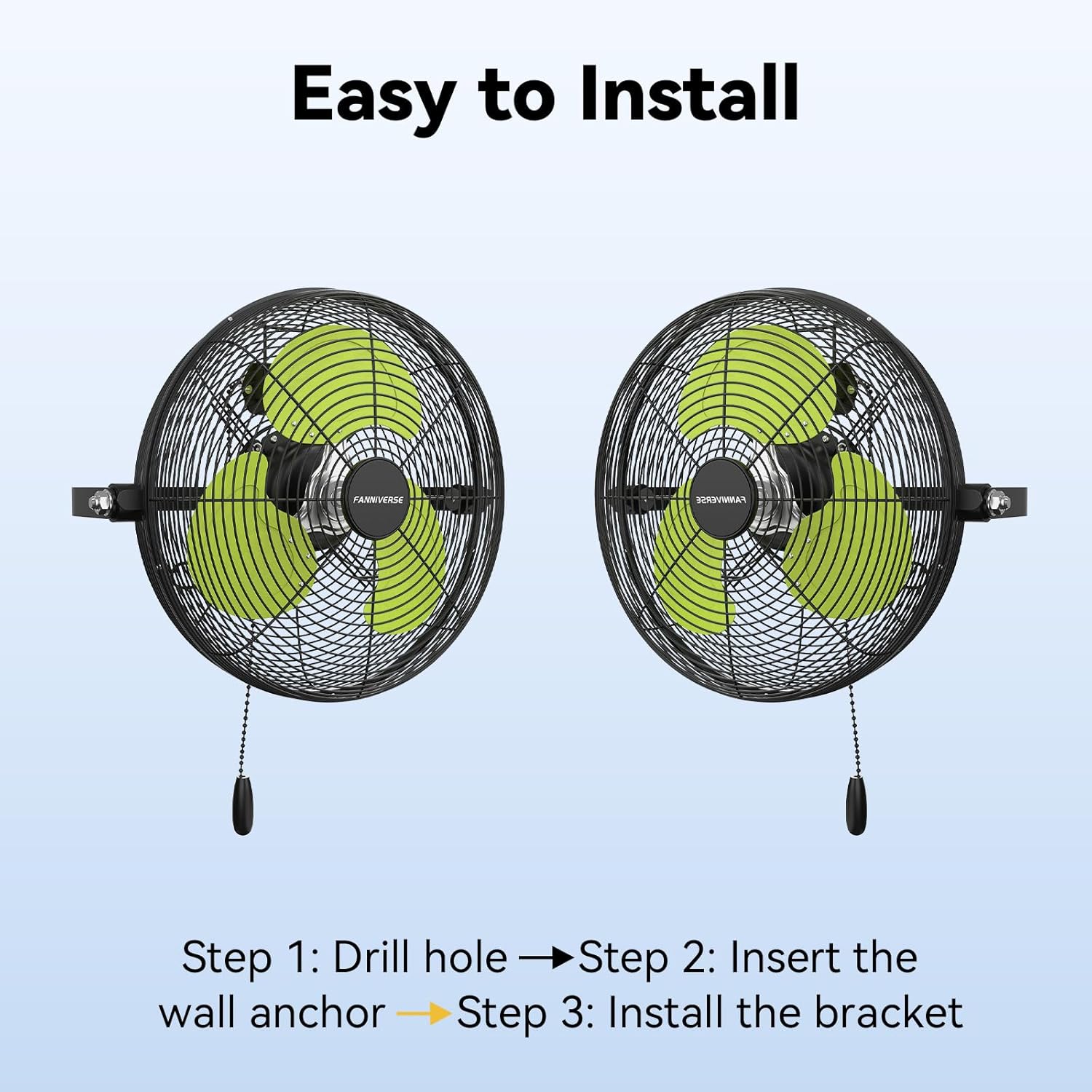 - Easy to Assemble: New frustration free packaging ensures all parts remain intact, making assembly straightforward with the included instructions. 12'' oscillating wall mount fan features a 360-degree tilting that allows the fan to cover a wide area.