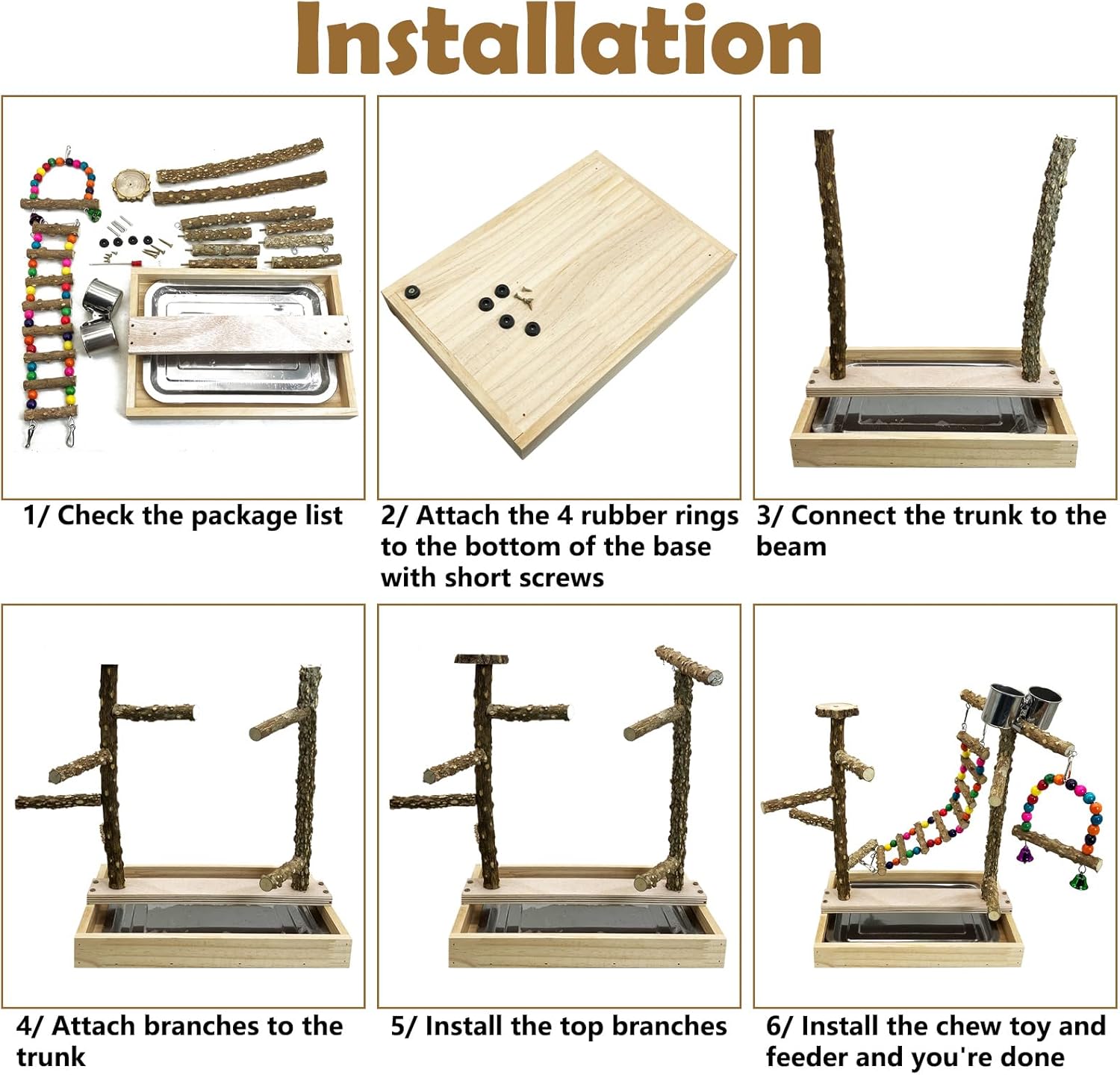 - EASY TO ASSEMBLE AND CLEAN: This wooden parrot play stand has a simple design; you can easily use screws to secure the perch; we put a small screwdriver in the package for assembly; the r-emovable tray allows for quick cleaning of droppings and debris; simply wipe the perches with a damp cloth; then let them dry in the sun; ensuring a h-ealthy and hygienic environment for your bird