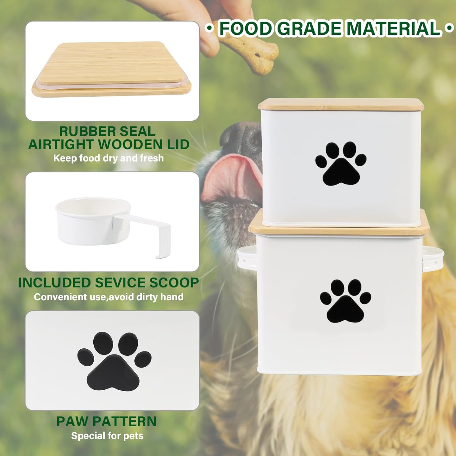 - 【Decorative&Functional】 - This powder coated white dog treat jar set with cute design serves as a decoration as well. Designed with both functionality and style in mind, this durable dog food canister is perfect for pet owners who value quality and convenience.