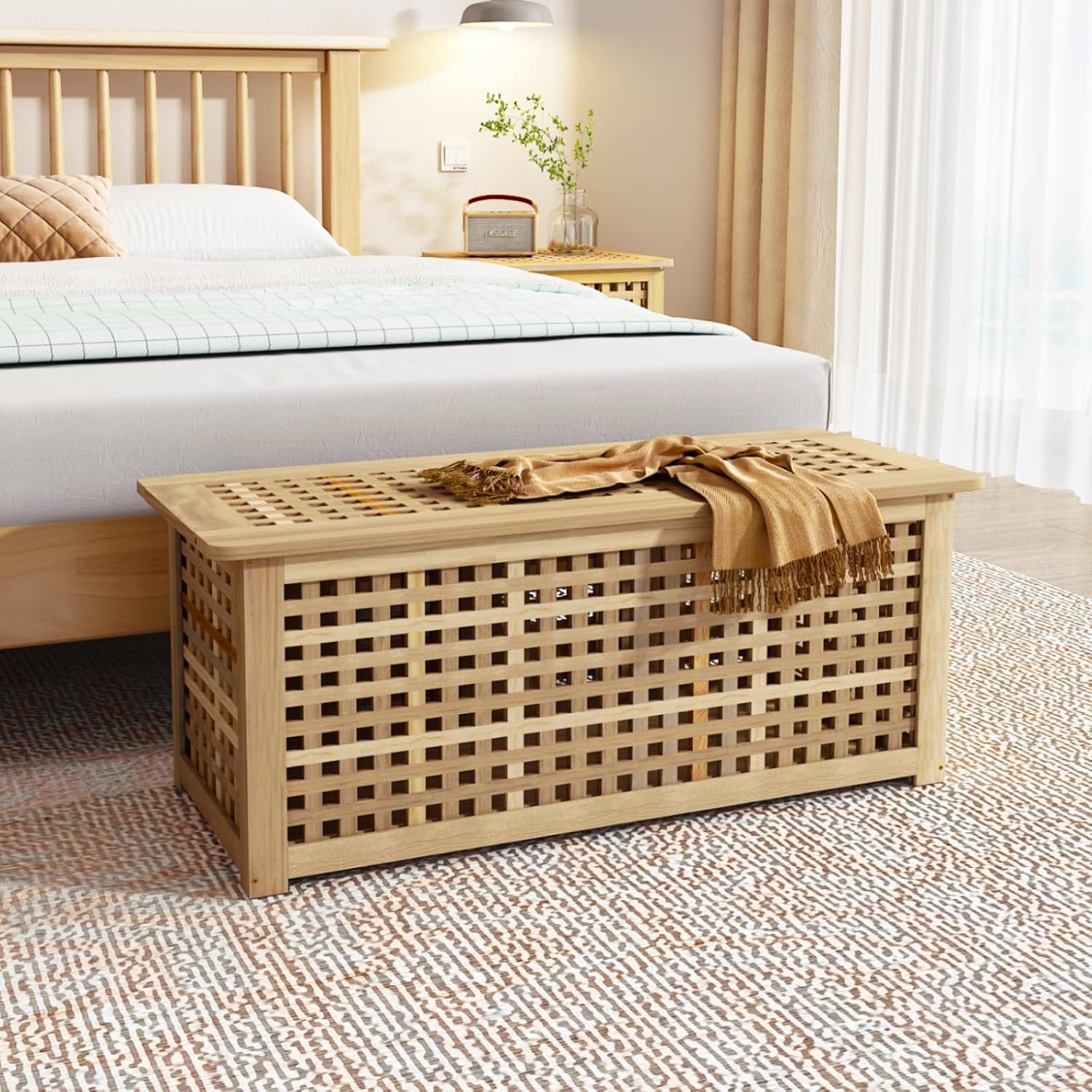 - Fits Any Room, Matches Any Style:With its classic grid design and natural acacia wood finish, this bench with storage blends seamlessly into any home decor. Whether you need a storage bench for your entryway, bedroom, living room, or bathroom, it’s as stylish as it is functional.
