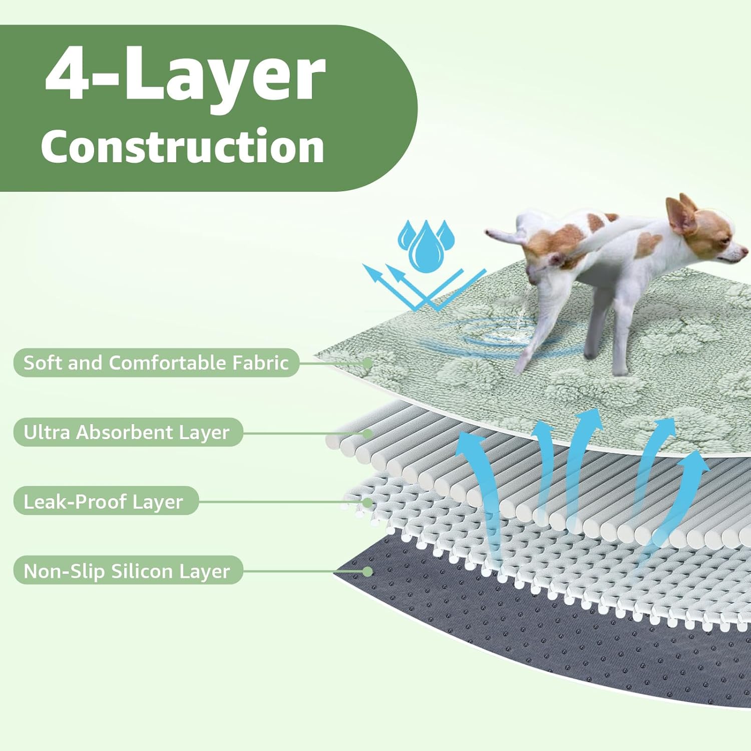 - Super Absorbent & Leak-Proof: With a soft and absorbent fabric top layer, washable puppy pads wick moisture away from the surface without the puddles stay on top of it. Keeps your floors dry and clean. The non-slip backing ensures the pad stays in place for added stability and safety