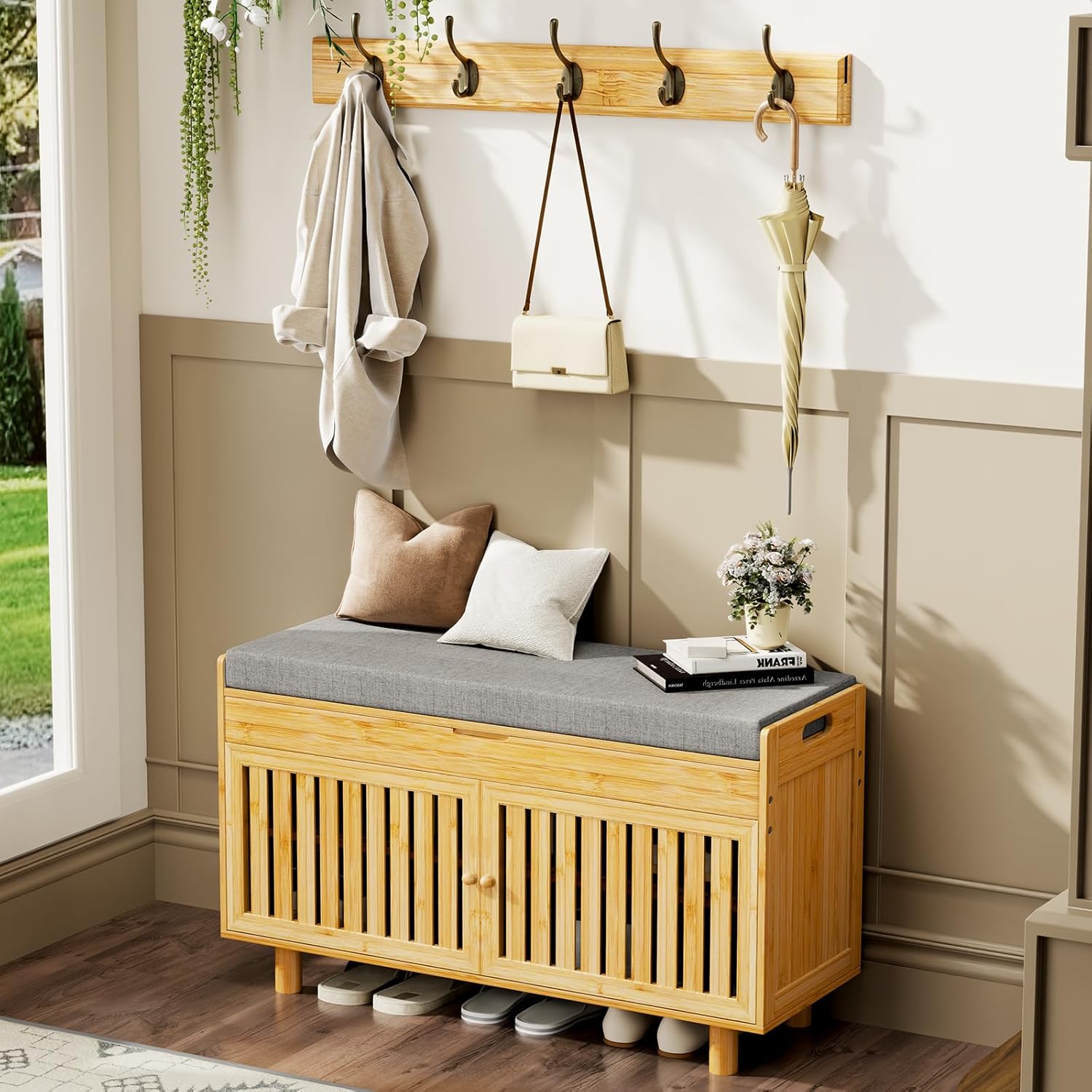 - 【Stylish and Practical】- This coat rack and shoe bench set effortlessly combines practicality and aesthetics, keeping everything organized in one place and reducing unnecessary space occupation. The seat cushion is made of soft sponge and covered with high-quality breathable linen fabric, which is easy to remove and clean, so you can sit comfortably and tie your shoelaces easily. The entrance shoe storage bench provides you with a comfortable and convenient shoe changing experience.