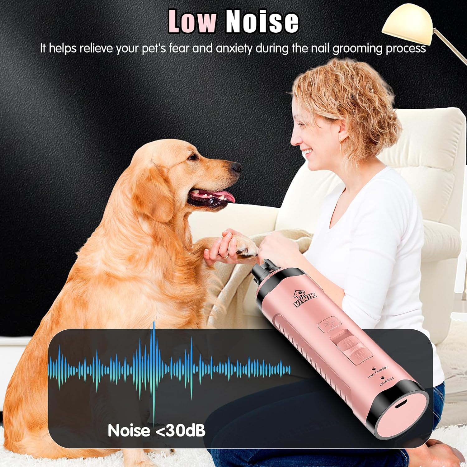 - Whisper-Quiet Operation: Make nail trimming a peaceful experience for both you and your furry friend with our super quiet dog nail grinder. With a noise level lower than 40dB, your pet won't be startled or annoyed during the grooming process. The low vibration design also ensures a smooth, stress-free trimming experience