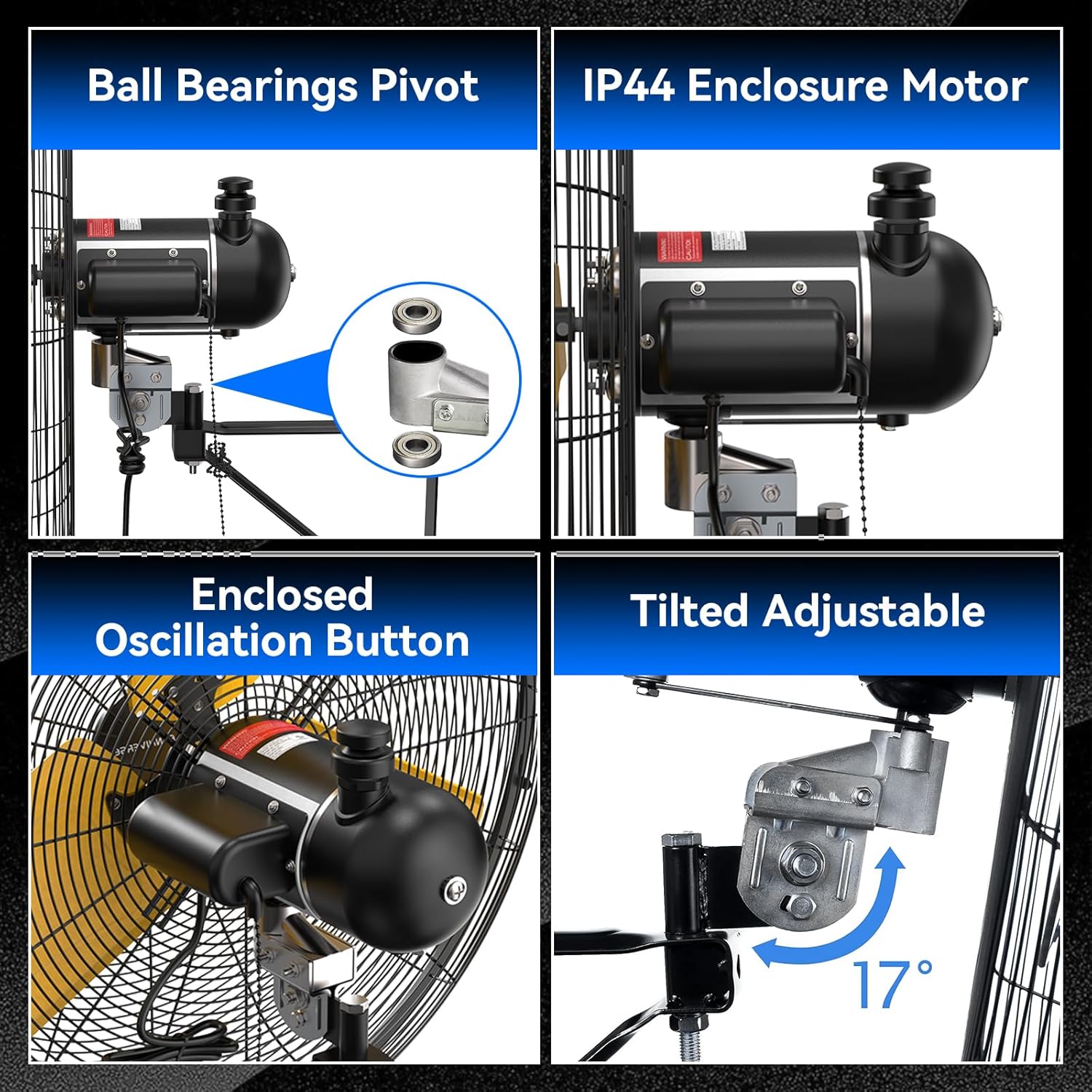 - ššššÆš²-šš®šš² ššš«š®ššš®š«š - Oscillating fan is sturdy and durable. OSHA compliant grille ensures safety, powder coating for excellent corrosion resistance, ball bearing pivot, equipped with wall mount, metal gear and aluminum blades enhance wind output. Rust-resistant grille ensures long-term safe and worry-free use while easy to clean and maintain.Extra long 6 feet + SIT waterproof power cord, 1/10 HP, 120V, 220 Watts, 60 Hz. UL safety certification