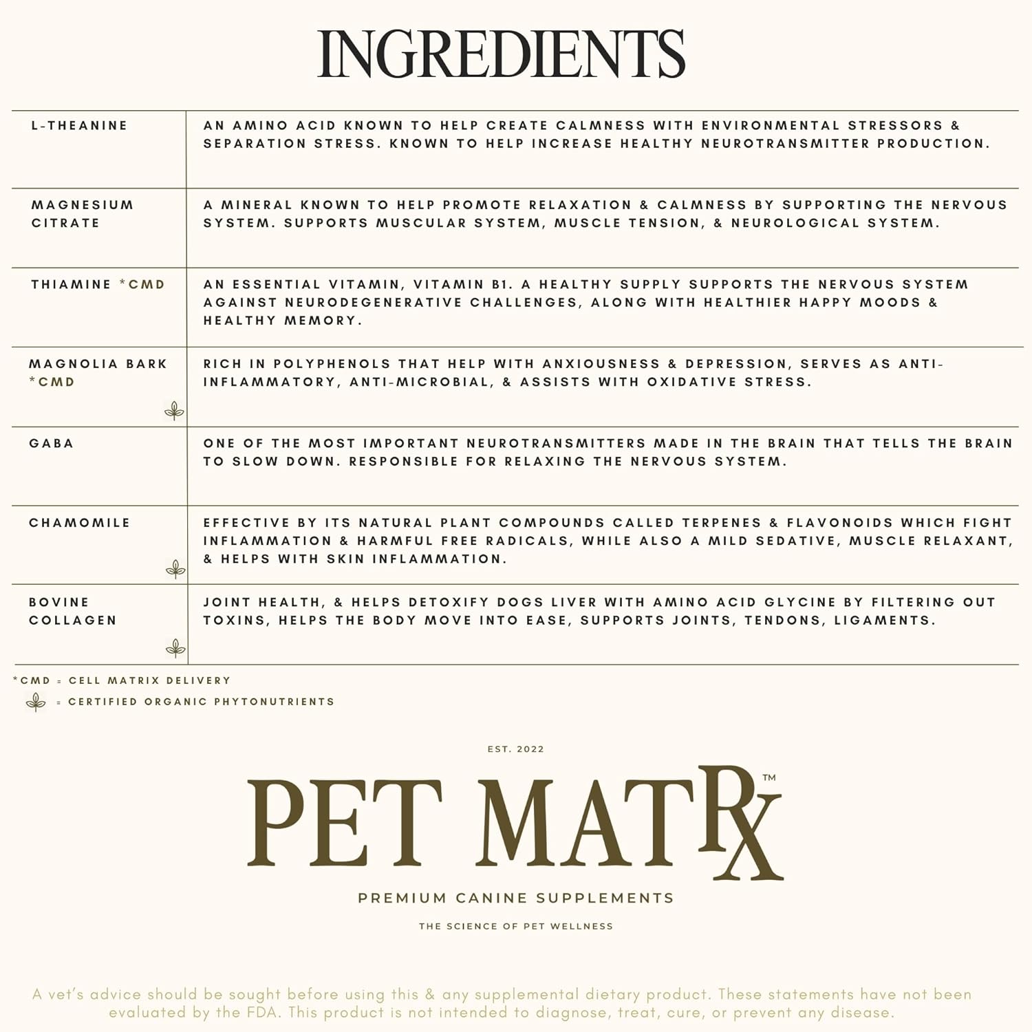 - Active Ingredients: This product contains L-Theanine, Magnesium Citrate, Thiamine, Magnolia Bark, GABA, Chamomile, and Bovine Collagen to support your dog's nervous system against stress