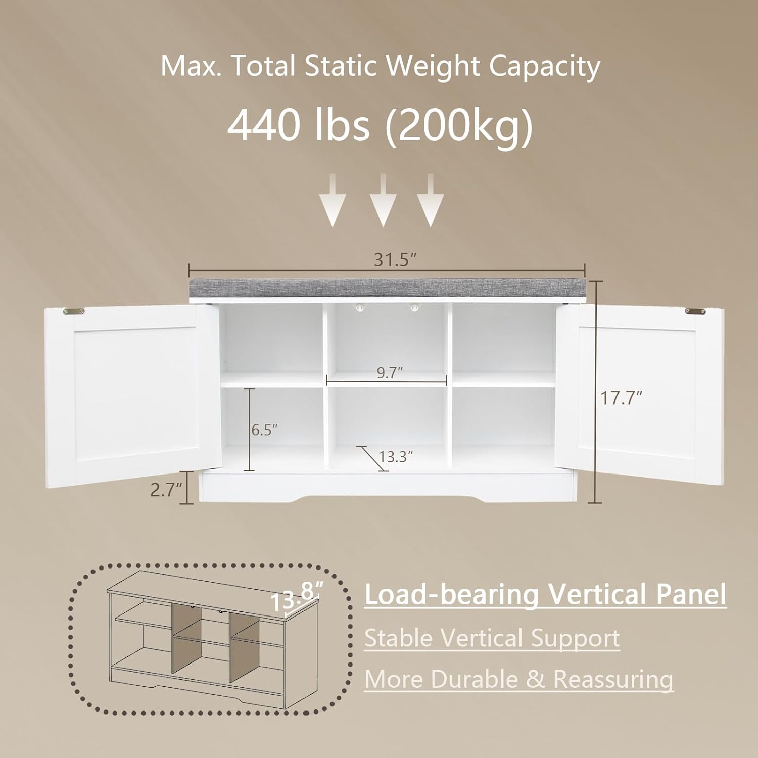 - 【Stable & Long-lasting】The shoe rack bench is made of high quality particle board. Durable compartments design provides extra vertical support, enabling it to bear a load up to 440lbs (200kg). Its removable padded design can help you remove and clean cover easily. Dimension: 31.5”L x 13.8”W x 17.7”H
