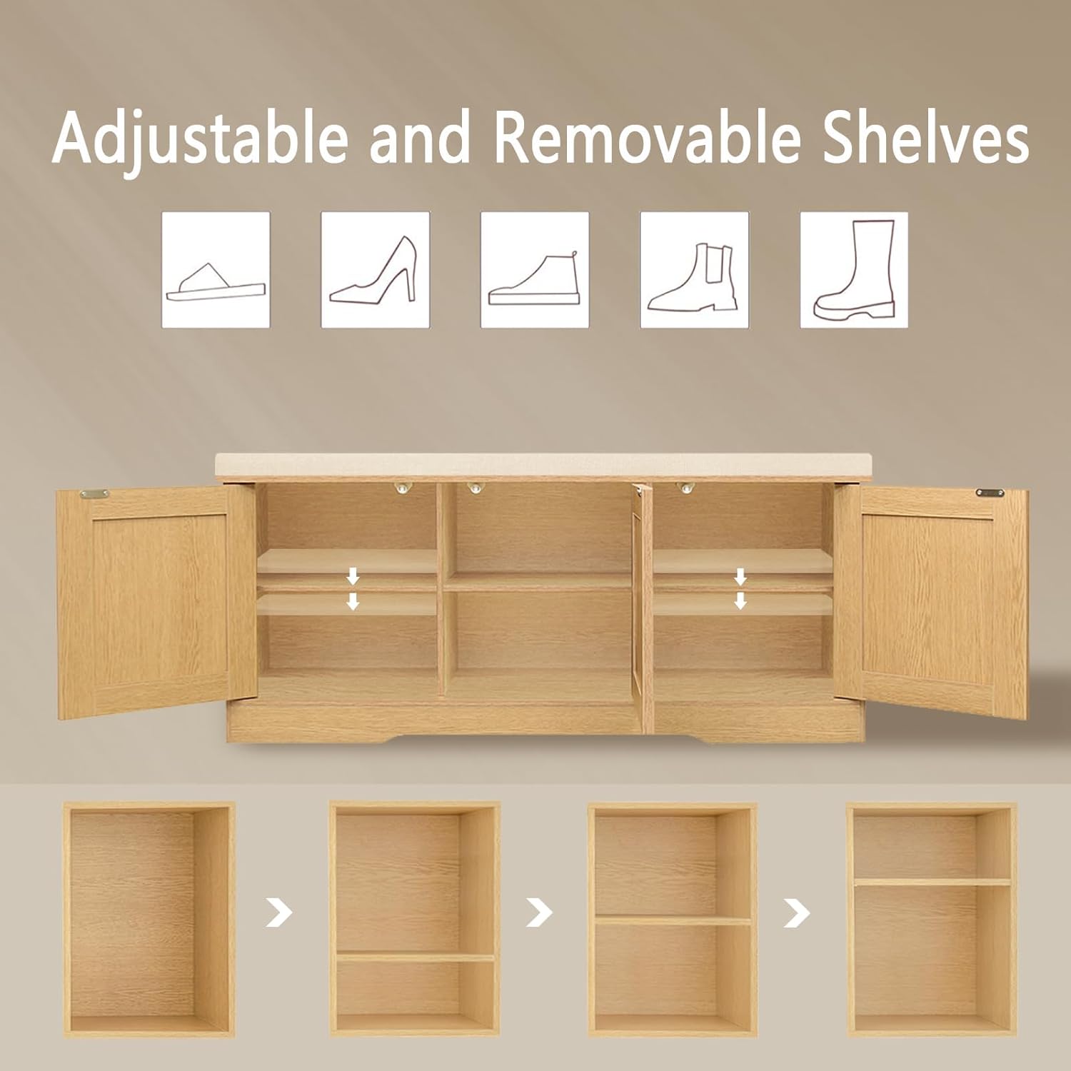 - 【Flexible for Multiple Needs】2 middle compartments are fixed for sneakers, high heels and sandals. The side compartments have 3 adjustable heights for slippers, tall boots or storage boxes. Use as an entryway bench, window seat or bedside bench to store blankets, books and toys in the living room and bedroom
