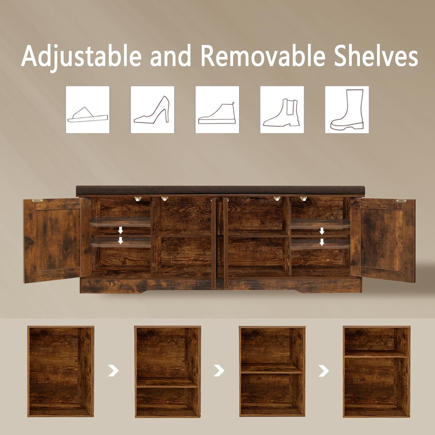 - 【Flexible for Multiple Needs】4 middle compartments are fixed for sneakers, high heels and sandals. The side compartments have 3 adjustable heights for slippers, tall boots or storage boxes. Use as an entryway bench, window seat or bedside bench to store blankets, books and toys in the living room and bedroom