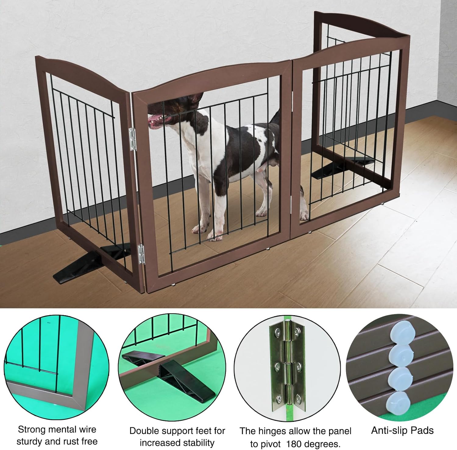 - 【Simple and Firm】This convertible wooden dog gate is a pet fence, room divider, and pet pen all in one. It combines wood and electroplated steel bars. Equipped with non - slip rubber feet, it protects your floor.