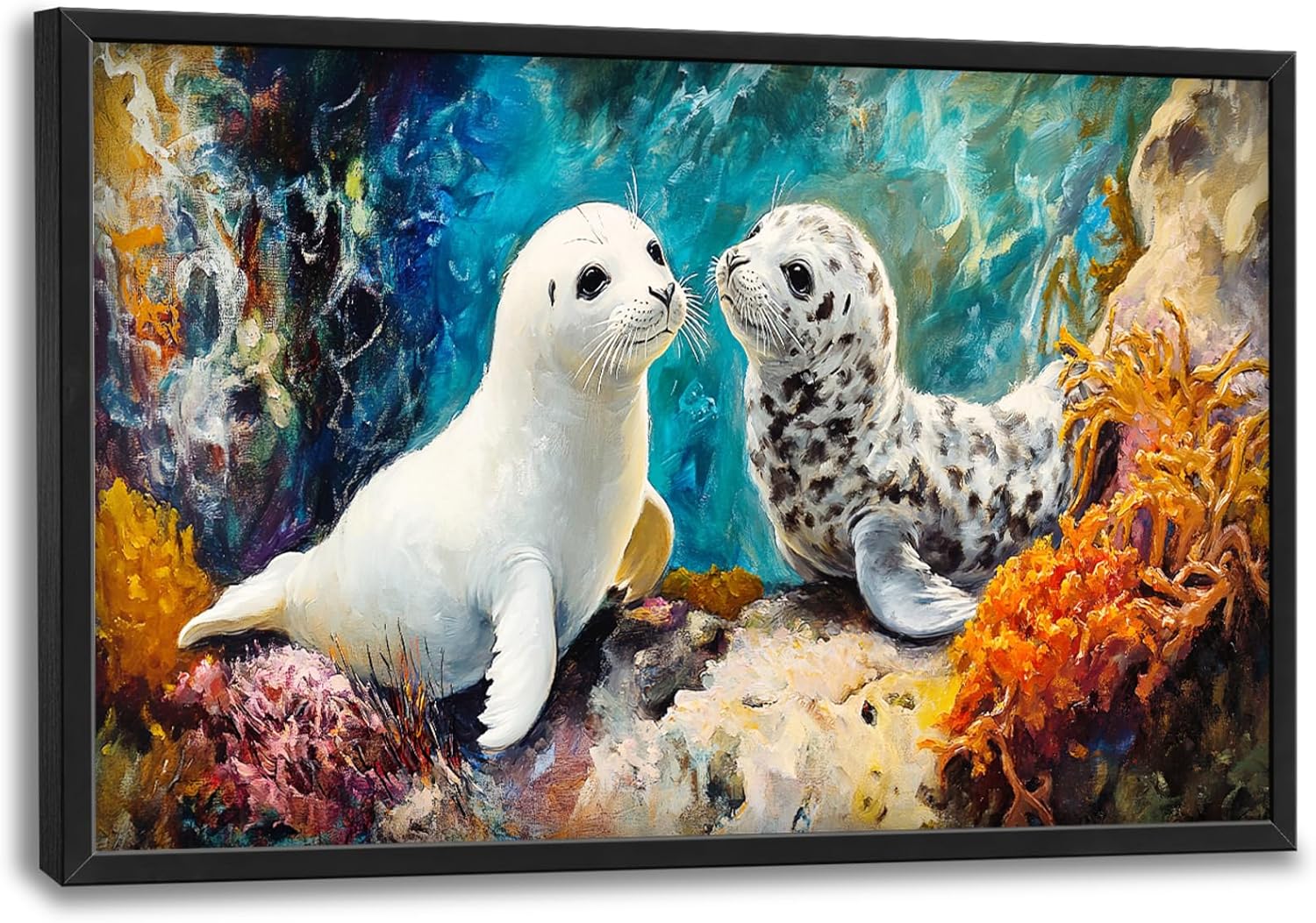 - 【Unique Design】 Oil painting of two baby seal cubs playing, with white fur and grey spots on their bodies, surrounded by coral reefs in an underwater environment with colorful sea plants. In the background, there is blue water and sunlight shining through it, creating vibrant colors and visible brush strokes.
