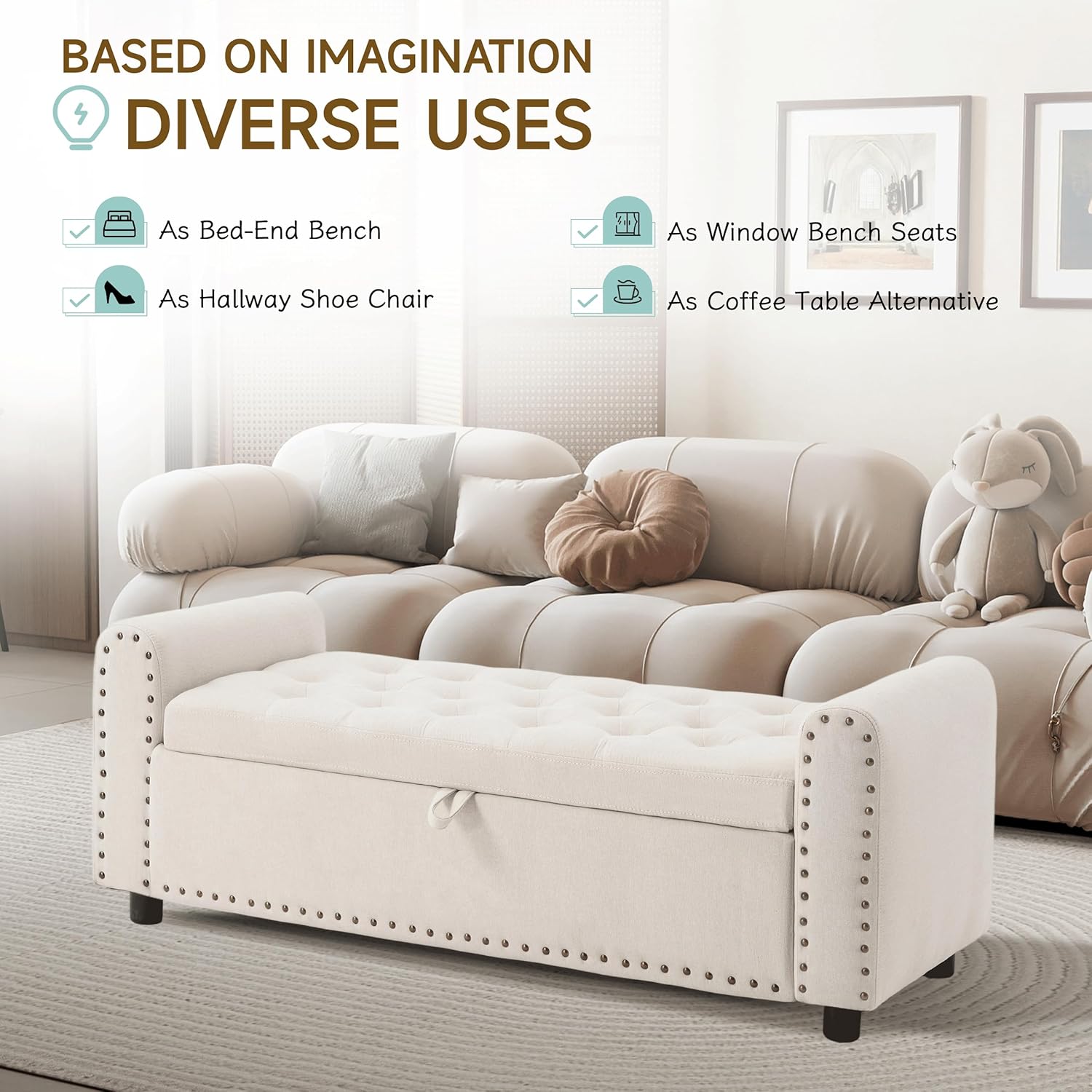 Ottoman with Storage, Tufted Storage Bench for Bedroom, 48" Fabrics End of Bed Bench, Upholstered Entryway Shoe Benches with Rolled Arm & Inner Zipper, Window Ottomans Chest with Rivets, Beige