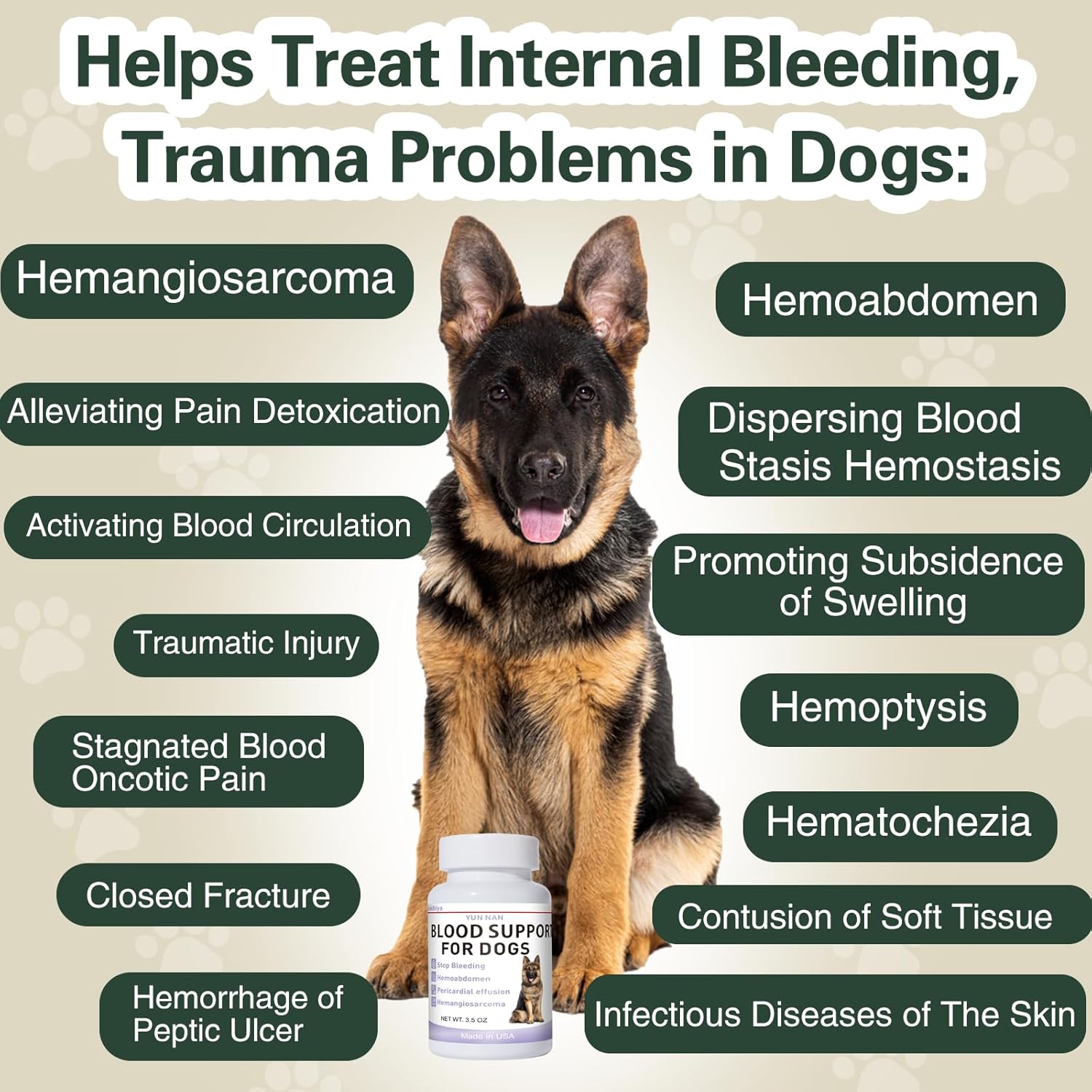 - Treat Hemangiosarcoma & Immune Health: Hemangiosarcoma can act like a silent time bomb, threatening your dog’s life. Our Yunnan powder not only helps slow tumor growth by cutting off its blood supply but also strengthens the immune system. It helps restore 85–95% of normal body functions, extending life and vitality for your furry friend