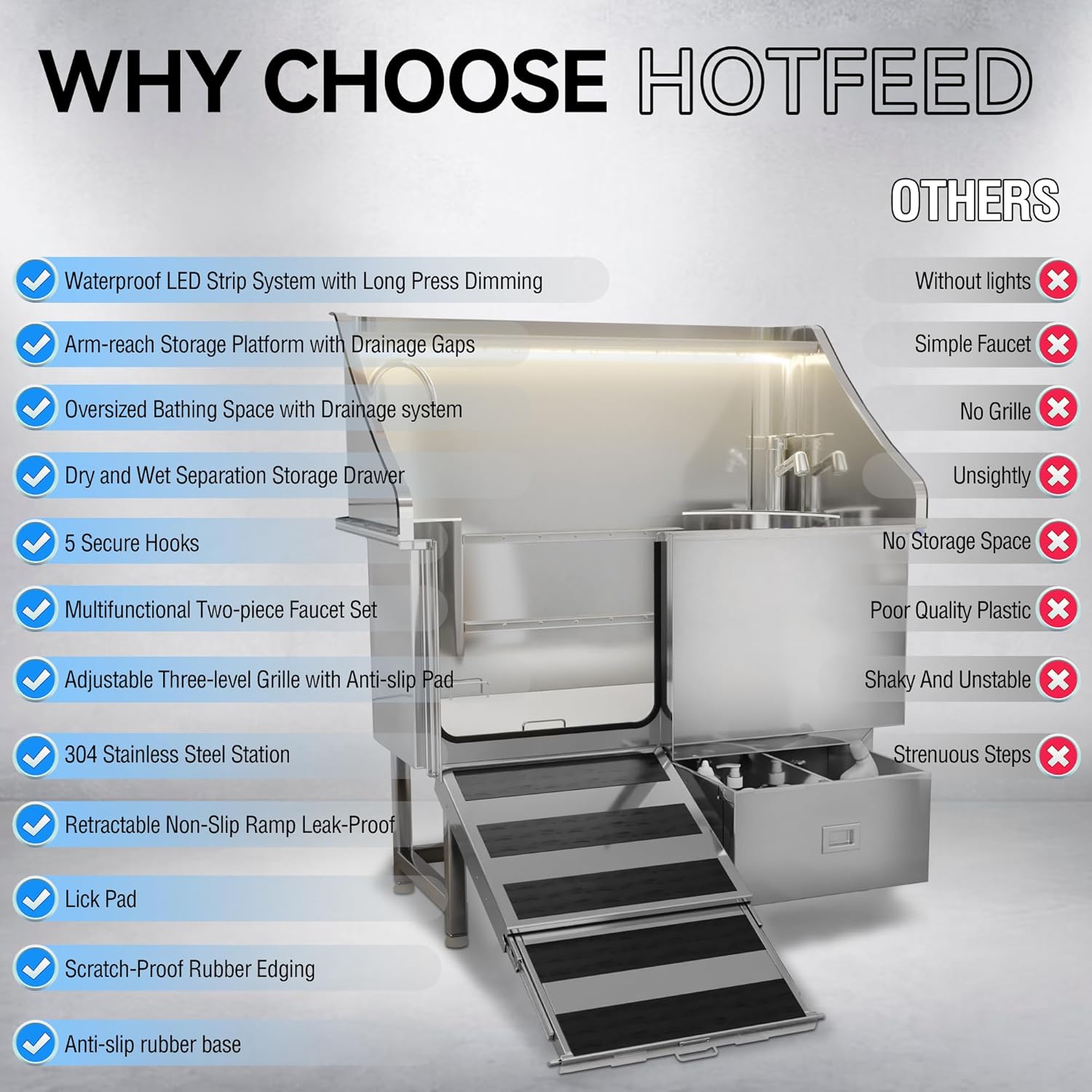 - Safety & Durability for Stress-Free Grooming - The 304 stainless steel dog bathtub resists corrosion and chewing, while scratch-proof rubber edging protects pets and owners from sharp edges. Combined with an anti-slip rubber base, dog bathtub ensures a secure, injury-free environment for all breeds