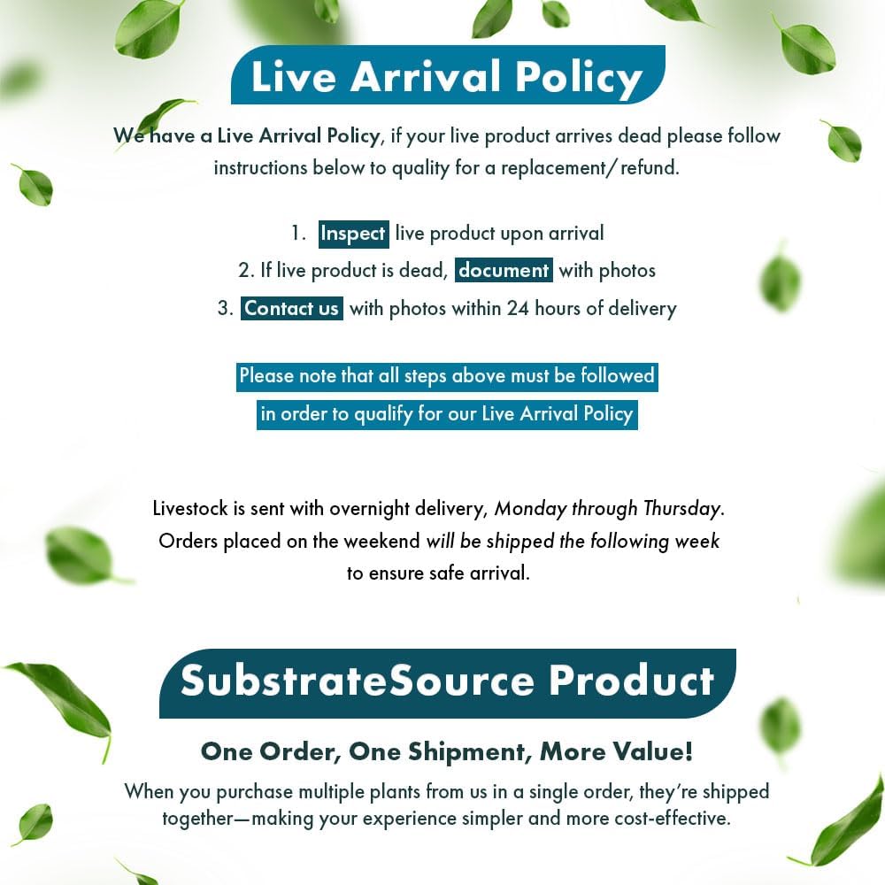 - SubstrateSource inspects each plant prior to shipping and ships all plants in healthy, stable condition with proper packing materials to ensure its safe arrival during shipping. Each plant is backed with a 100% dead-on-arrival replacement guarantee. To qualify, customers must provide a photo of the DOA plant within 24 hours of delivery.