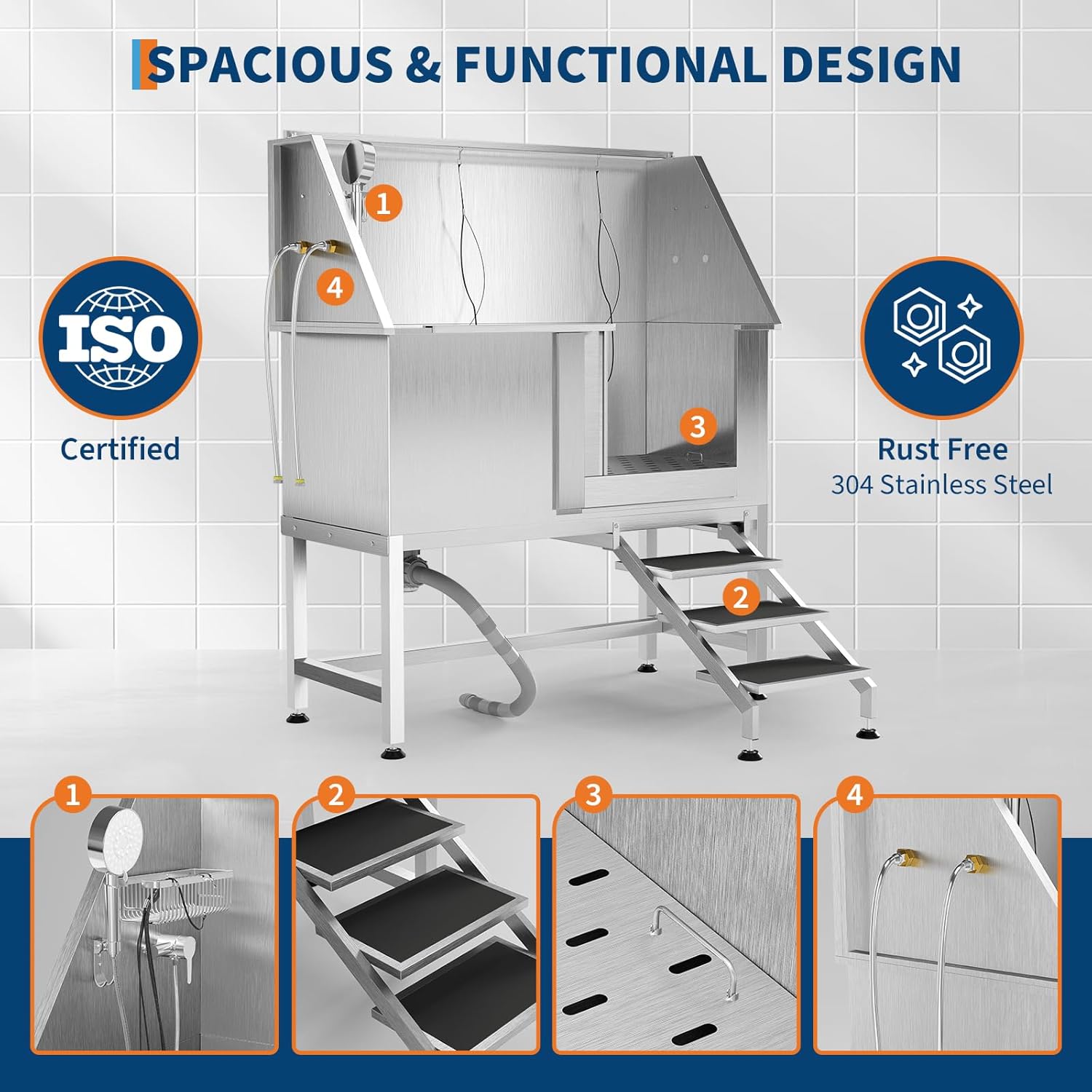 - Efficient Drainage System Removable floor grate prevents water accumulation and simplifies post-bath cleanup. Maintains tidy workspace during grooming sessions.