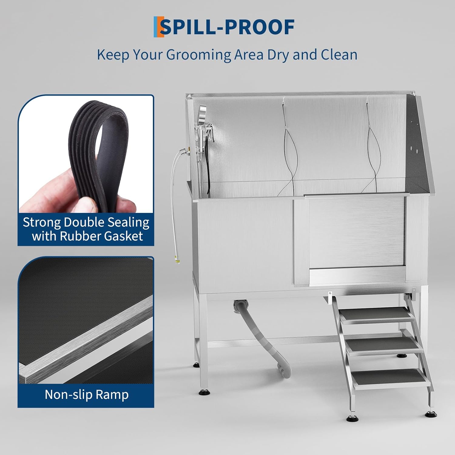 - Safety-Equipped Wash Tub Includes non-slip access ramp, storage cabinet, and locking gate mechanism to secure pets during bathing procedures.