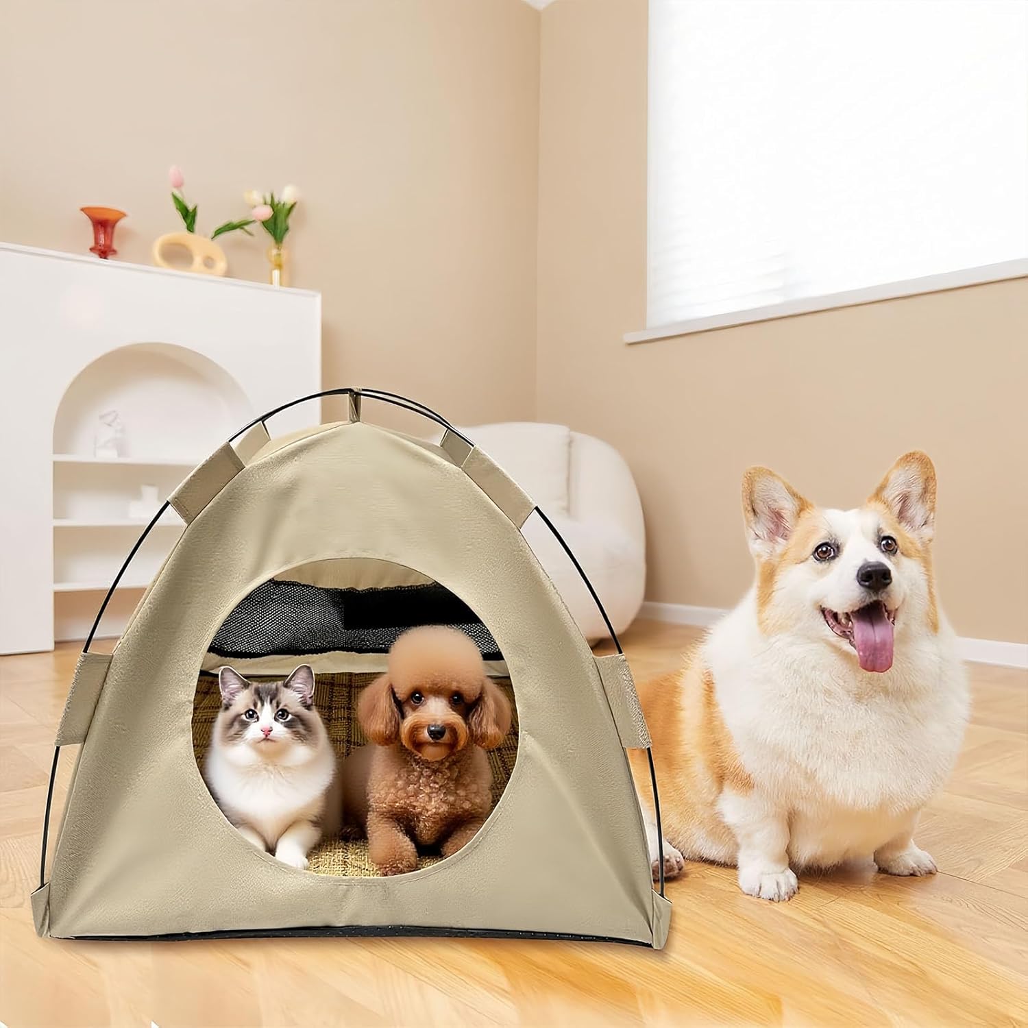 BreezyDen Pop-Up Pet Tent – Portable Hideaway for Cats & Small Dogs, Portable Indoor/Outdoor Pet Tent House with Mesh Window, Waterproof, Breathable, Scratch-Resistant, Fully Washable (Beige,L)