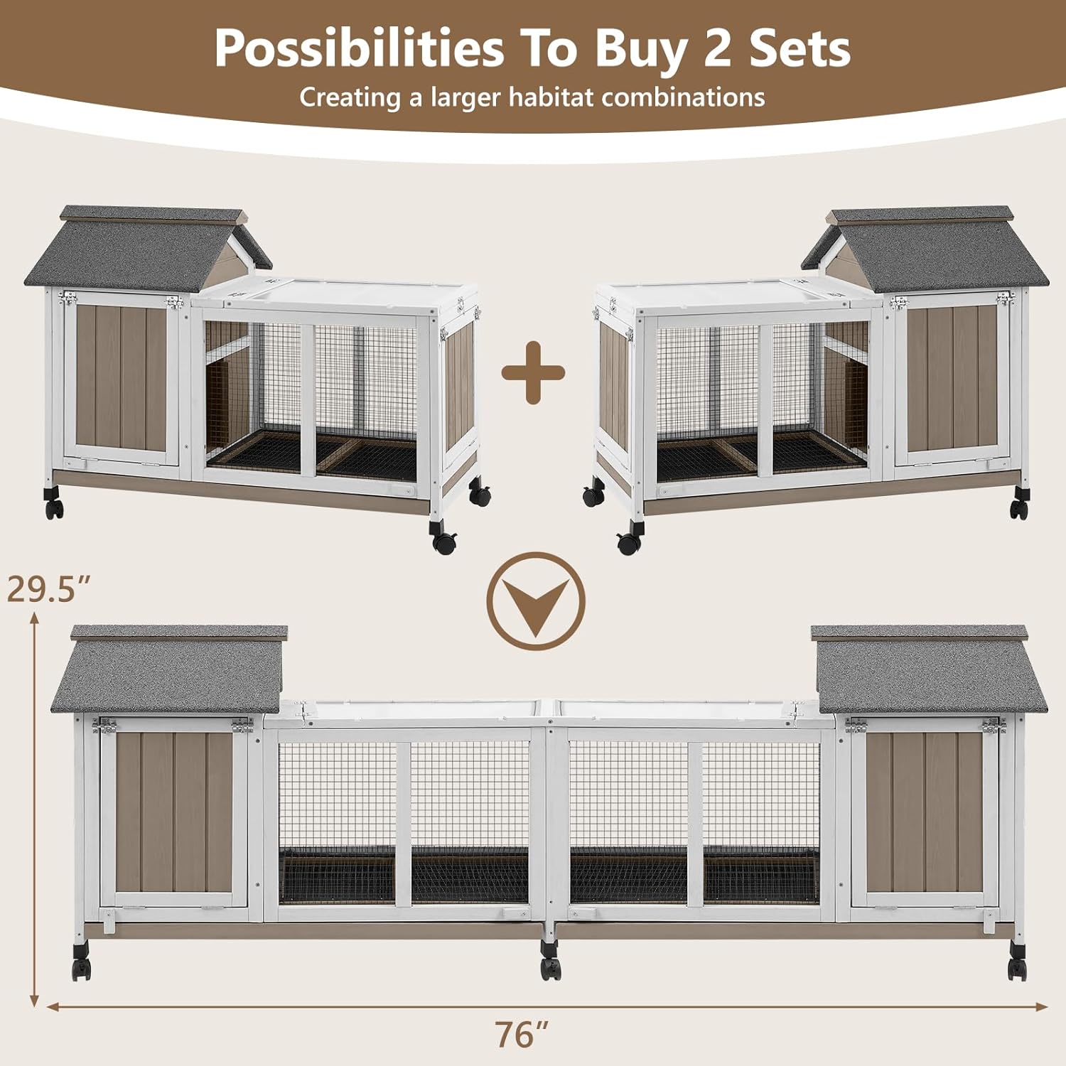- A Comfortable House for Pets-Each rabbit hutch has a comfortable space for activities, where rabbits can roam freely, play and take a nap.Two separate rabbit cages can be combined to give your pet a more spacious living space. Perfect for 1-3 bunnies, guinea pigs,chicks.