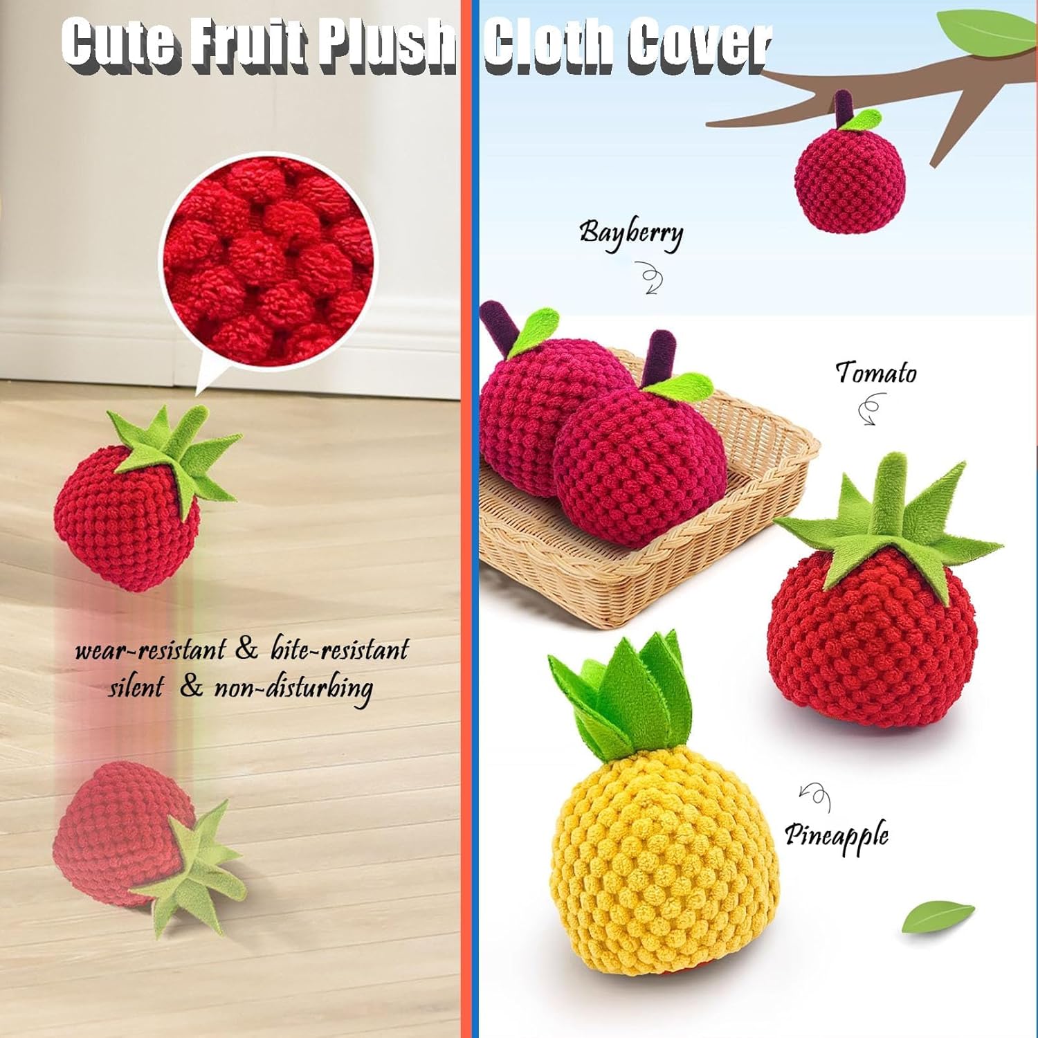 - 【Durable TPU with Plush Cover】Built from strong TPU material and paired with a fun fruit-inspired plush cover, this toy is safe, non-toxic, and gentle on your dog’s mouth. The soft cover adds extra sensory fun while protecting floors from scratches, making it perfect for both indoor and outdoor play sessions.